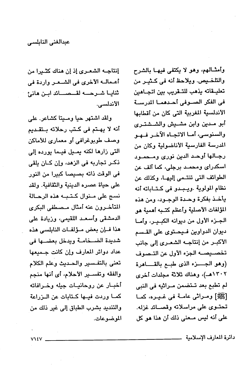 وأمثالهم، وهو لا يكتفى فيها بالشرح والتلخيص. ويلاحظ أنه فى كثير من تعليقاته يذهب للتقريب بين اتجاهين فى الفكر الصوفى أحدهما المدرسة الأندلسية المغربية التى كان من أقطابها أبو مدين وابن مشيش والششترى والسنوسى، أما الاتجاه الآخر فهو المدرسة الفارسية الأناضولية وكان من رجالها أوحد الدين نورى ومحمود اسكدراى ومحمد برجلى، كما ألف عن الطوائف التى تنتمى إليها، وكذلك عن نظام المولوية. ويبدو فى كتاباته أنه يأخذ بفكرة وحدة الوجود، ومن هذه المؤلفات الأصلية وأعظم كتبه أهمية هو الجزء الأول من ديوانه الكبير، وأما ديوان الدواوين فيحتوى على القسم الأكبر من إنتاجه الشعرى إلى جانب تخصيصه الجزء الأول عن التصوف (وهو الجزء الذى طبع بالقاهرة 1302 هـ)، وهناك ثلاثة مجلدات أخرى لم تطبع بعد تتضمن مراثيه فى النبى [-صلى اللَّه عليه وسلم-] ومراثى عامة فى غيره، كما تحتوى على مراسلاته وقصائد غزله. على أنه ليس معنى ذلك أن هذا هو كل إنتاجه الشعرى إذ إن هناك كثيرا من أعماله الأخرى فى الشعر واردة فى ثنايا شرحه لقصائد ابن هانئ الأندلسى.