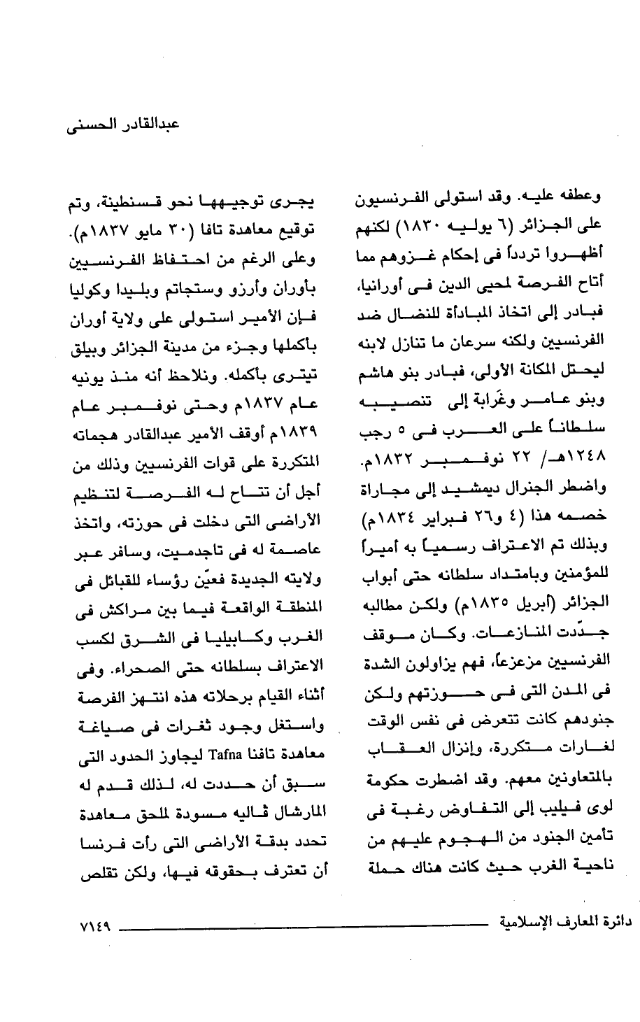 وعطفه عليه. وقد استولى الفرنسيون على الجزائر (6 يوليه 1830) لكنهم أظهروا ترددًا فى إحكام غزوهم مما أتاح الفرصة لمحيى الدين فى أورانيا، فبادر إلى اتخاذ المبادأة للنضال ضد الفرنسيين ولكنه سرعان ما تنازل لابنه ليحتل المكانة الأولى، فبادر بنو هاشم وبنو عامر وغَرابة إلى تنصيبه سلطانًا على العرب فى 5 رجب 1248 هـ/ 22 نوفمبر 1832 م. واضطر الجنرال ديمشيد إلى مجاراة خصمه هذا (4 و 26 فبراير 1834 م) وبذلك تم الاعتراف رسميًا به أميرًا للمؤمنين وبامتداد سلطانه حتى أبواب الجزائر (أبريل 1835 م) ولكن مطالبه جدّدت المنازعات. وكان موقف الفرنسيين مزعزعًا، فهم يزاولون الشدة فى المدن التى فى حوزتهم ولكن جنودهم كانت تتعرض فى نفس الوقت لغارات متكررة، وإنزال العقاب بالمتعاونين معهم. وقد اضطرت حكومة لوى فيليب إلى التفاوض رغبة فى تأمين الجنود من الهجوم عليهم من ناحية الغرب حيث كانت هناك حملة يجرى توجيهها نحو قسنطينة، وتم توقيع معاهدة تافا (30 مايو 1837 م). وعلى الرغم من احتفاظ الفرنسيين بأوران وأرزو وستجاتم وبليدا وكوليا فإن الأمير استولى على ولاية أوران بأكملها وجزء من مدينة الجزائر وبيلق تيترى بأكمله. ونلاحظ أنه منذ يونيه عام 1837 م وحتى نوفمبر عام 1839 م أوقف الأمير عبد القادر هجماته المتكررة على قوات الفرنسيين وذلك من أجل أن تتاح له الفرصة لتنظيم الأراضى التى دخلت فى حوزته، واتخذ عاصمة له فى تاجدميت، وسافر عبر ولايته الجديدة فعيّن رؤساء للقبائل فى المنطقة الواقعة فيما بين مراكش فى الغرب وكابيليا فى الشرق لكسب الاعتراف بسلطانه حتى الصحراء. وفى أثناء القيام برحلاته هذه انتهز الفرصة واستغل وجود ثغرات فى صياغة معاهدة تافنا Tafna ليجاوز الحدود التى سبق أن حددت له، لذلك قدم له المارشال فاليه مسودة لملحق معاهدة تحدد بدقة الأراضى التى رأت فرنسا أن تعترف بحقوقه فيها، ولكن تقلص