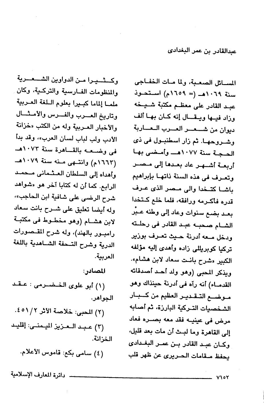 المسائل الصعبة، ولما مات الخفاجى سنة 1069 هـ (= 1659 م) استحوذ عبد القادر على معظم مكتبة شيخه وزاد فيها ويقال إنه كان بها ألف ديوان من شعر العرب العاربة وشروحها. ثم زار اسطنبول فى ذى الحجة سنة 1077 هـ وأمضى بها أربعة أشهر عاد بعدها إلى مصر وتعرف فى هذه السنة ذاتها بإبراهيم باشا كتخدا والى مصر الذى عرف قدره فأكرمه ورافقه، فلما خلع كتخدا بعد بضع سنوات وعاد إلى وطنه عبر الشام صحبه عبد القادر فى رحلته ودخل معه أدرنة حيث تعرف بوزير تركيا كوبريللى زاده واهدى إليه مؤلفه الكبير "شرح بانت سعاد لابن هشام". ويذكر المحبى (وهو ولد أحد اصدقائه القدماء) أنه رآه فى ادرنة حينذاك وهو موضع التقدير العظيم من كبار الشخصيات التركية البارزة، ثم أصابه مرض فى عينيه فقد معه بصره فعاد إلى القاهرة وما لبث أن مات بعد قليل، وكان عبد القادر بن عمر البغدادى يحفظ مقامات الحريرى عن ظهر قلب وكثيرا من الدواوين الشعرية والمنظومات الفارسية والتركية، وكان ملما إلماما كبيرا بعلوم اللغة العربية وتاريخ العرب والفرس والأمثال والأخبار العربية وله من الكتب "خزانة الأدب ولب لباب لسان العرب"، وقد بدأ فى وضعه بالقاهرة سنة 1073 هـ (1663 م) وانتهى منه سنة 1079 هـ وأهداه إلى السلطان العثمانى محمد الرابع. كما أن له كتابا آخر هو "شواهد شرح الرضى على شافية ابن الحاجب"، وله أيضا تعليق على شرح بانت سعاد لابن هشام (وهو مخطوط فى مكتبة رامبور بالهند)، وله شرح المقصورات الدرية وشرح التحفة الشاهدية باللغة العربية.