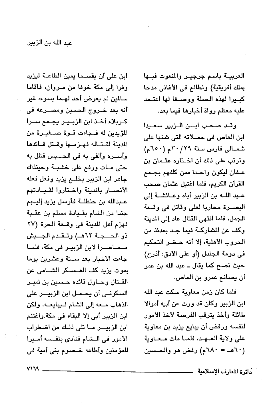 وقد صحب ابن الزبير سعيدا ابن العاص فى حملاته التى شنها على شمالى فارس سنة 29/ 30 هـ (650 م) وترتب على ذلك أن اختاره عثمان بن عفان ليكون واحدا ممن كلفهم بجمع القرآن الكريم، فلما اغتيل عثمان صحب عبد اللَّه بن الزبير أباه وعائشة إلى البصرة محاربا لعلى وقاتل فى وقعة الجمل، فلما انتهى القتال عاد إلى المدينة وكف عن المشاركة فيما جد بعدئذ من الحروب الأهلية، إلا أنه حضر التحكيم فى دومة الجندل (أو على الأدق: أذرح) حيث نصح كما يقال -عبد اللَّه بن عمر أن يصانع عمرو بن العاص.