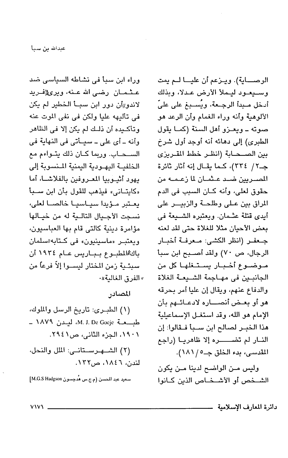 الوصاية). ويزعم أن عليا لم يمت وسيعود ليملأ الأرض عدلا، وبذلك أدخل مبدأ الرجعة، ويُسبغ على علىّ الألوهية وأنه وراء الغمام وأن الرعد هو صوته -ويعزو أهل السنة (كما يقول الطبرى) إلى دهائه أنه أوجد أول شرخ بين الصحابة (انظر خطط المقريزى جـ 2/ 334)، كما يقال إنه أثار ثائرة المصريين ضد عثمان لما زعمه من حقوق لعلى، وأنه كان السبب فى الدم المراق بين على وطلحة والزبير على أيدى قتلة عثمان. ويعتبره الشيعة فى بعض الأحيان مثلا للغلاة حتى لقد لعنه جعفر (انظر الكشى: معرفة أخبار الرجال، ص 70) ولقد أصبح ابن سبأ موضوع أخبار يستغلها كل من الجانبين فى مهاجمة الشيعة الغلاة والدفاع عنهم، ويقال إن عليا أمر بحرقه هو أو بعض أنصاره لادعائهم بأن الإمام هو اللَّه، وقد استغل الإسماعيلية هذا الخبر لصالح ابن سبأ فقالوا: إن النار لم تضره إلا ظاهريا (راجع المقدسى، بدء الخلق جـ 5/ 181).