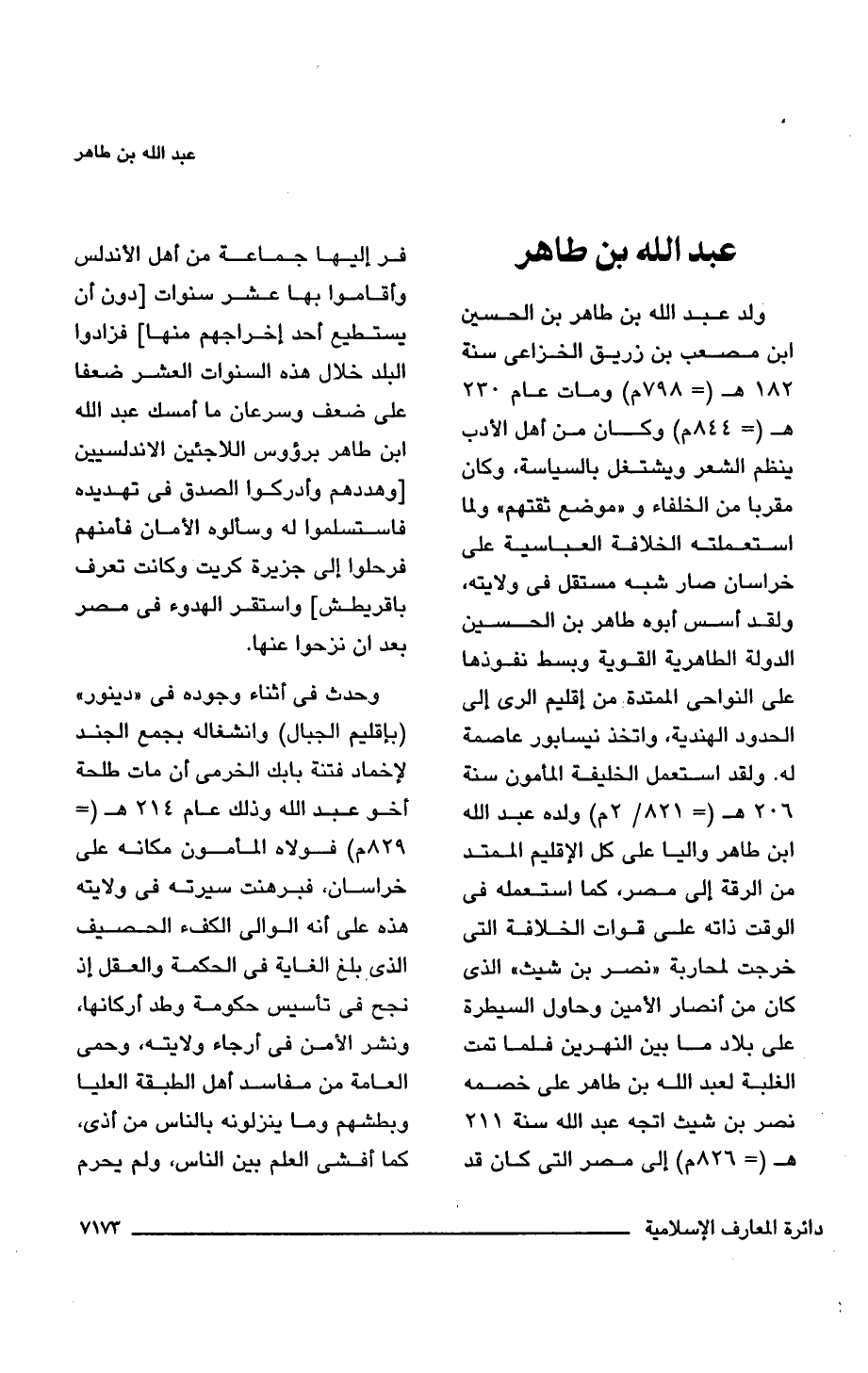 ولد عبد اللَّه بن طاهر بن الحسين ابن مصعب بن زريق الخزاعى سنة 182 هـ (= 798 م) ومات عام 230 هـ (= 844 م) وكان من أهل الأدب ينظم الشعر ويشتغل بالسياسة، وكان مقربا من الخلفاء و"موضع ثقتهم" ولما استعملته الخلافة العباسية على خراسان صار شبه مستقل فى ولايته، ولقد أسس أبوه طاهر بن الحسين الدولة الطاهرية القوية وبسط نفوذها على النواحى الممتدة من إقليم الرى إلى الحدود الهندية، واتخذ نيسابور عاصمة له. ولقد استعمل الخليفة المأمون سنة 206 هـ (= 821/ 2 م) ولده عبد اللَّه ابن طاهر واليا على كل الإقليم الممتد من الرقة إلى مصر، كما استعمله فى الوقت ذاته على قوات الخلافة التى خرجت لمحاربة "نصر بن شيث" الذى كان من أنصار الأمين وحاول السيطرة على بلاد ما بين النهرين فلما تمت الغلبة لعبد اللَّه بن طاهر على خصمه نصر بن شيث اتجه عبد اللَّه سنة 211 هـ (= 826 م) إلى مصر التى كان قد فر إليها جماعة من أهل الأندلس وأقاموا بها عشر سنوات [دون أن يستطيع أحد إخراجهم منها] فزادوا البلد خلال هذه السنوات العشر ضعفا على ضعف وسرعان ما أمسك عبد اللَّه ابن طاهر برؤوس اللاجئين الاندلسيين [وهددهم وأدركوا الصدق فى تهديده فاستسلموا له وسألوه الأمان فأمنهم فرحلوا إلى جزيرة كريت وكانت تعرف باقريطش] واستقر الهدوء فى مصر بعد أن نزحوا عنها.