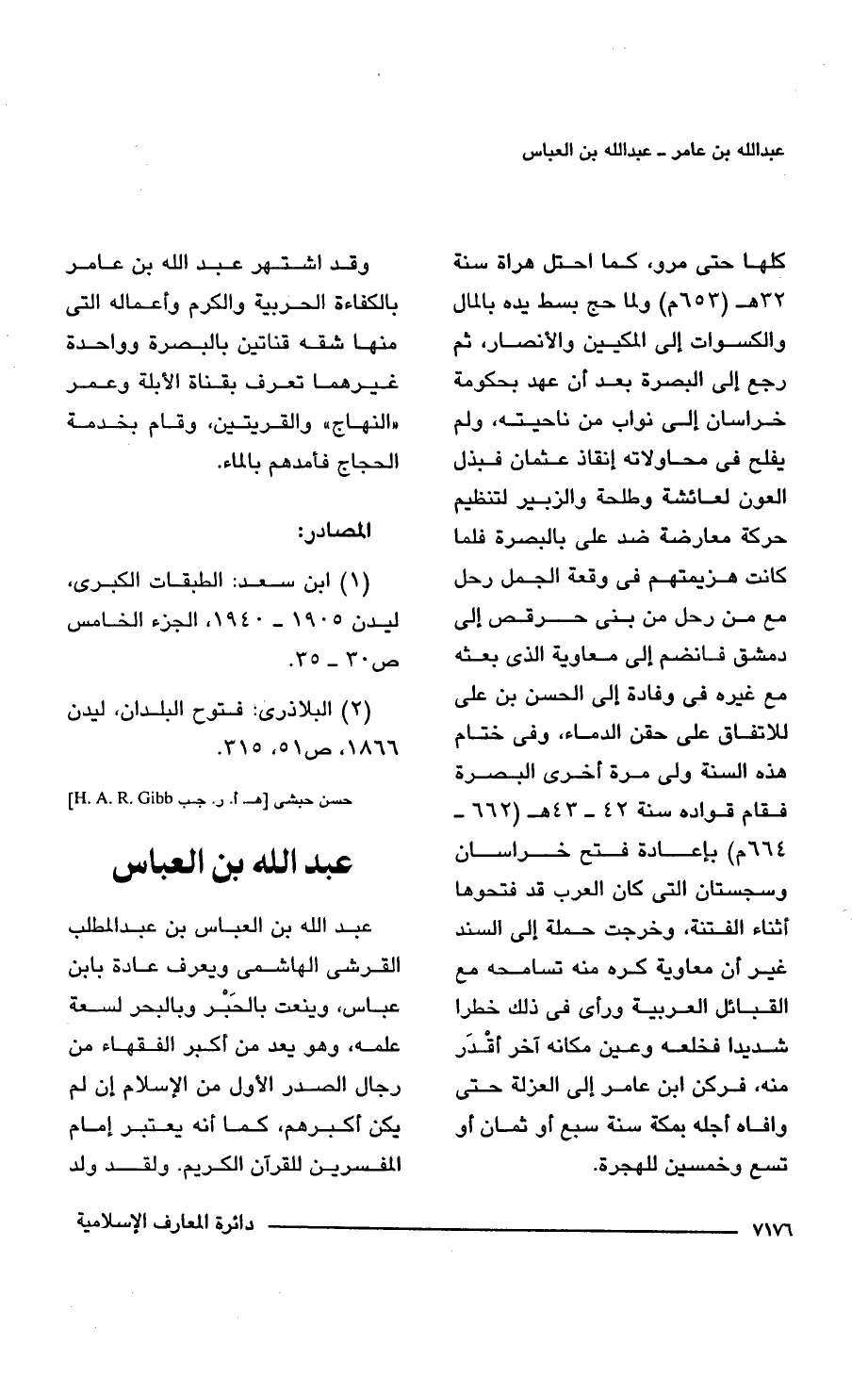 كلها حتى مرو، كما احتل هراة سنة 32 هـ (653 م) ولما حج بسط يده بالمال والكسوات إلى المكيين والأنصار، ثم رجع إلى البصرة بعد أن عهد بحكومة خراسان إلى نواب من ناحيته، ولم يفلح فى محاولاته إنقاذ عثمان فبذل العون لعائشة وطلحة والزبير لتنظيم حركة معارضة ضد على بالبصرة فلما كانت هزيمتهم فى وقعة الجمل رحل مع من رحل من بنى حرقص إلى دمشق فانضم إلى معاوية الذى بعثه مع غيره فى وفادة إلى الحسن بن على للاتفاق على حقن الدماء، وفى ختام هذه السنة ولى مرة أخرى البصرة فقام قواده سنة 42 - 43 هـ (662 - 664 م) بإعادة فتح خراسان وسجستان التى كان العرب قد فتحوها أثناء الفتنة، وخرجت حملة إلى السند غير أن معاوية كره منه تسامحه مع القبائل العربية ورأى فى ذلك خطرا شديدا فخلعه وعين مكانه آخر أقْدَر منه، فركن ابن عامر إلى العزلة حتى وافاه أجله بمكة سنة سبع أو ثمان أو تسع وخمسين للهجرة.