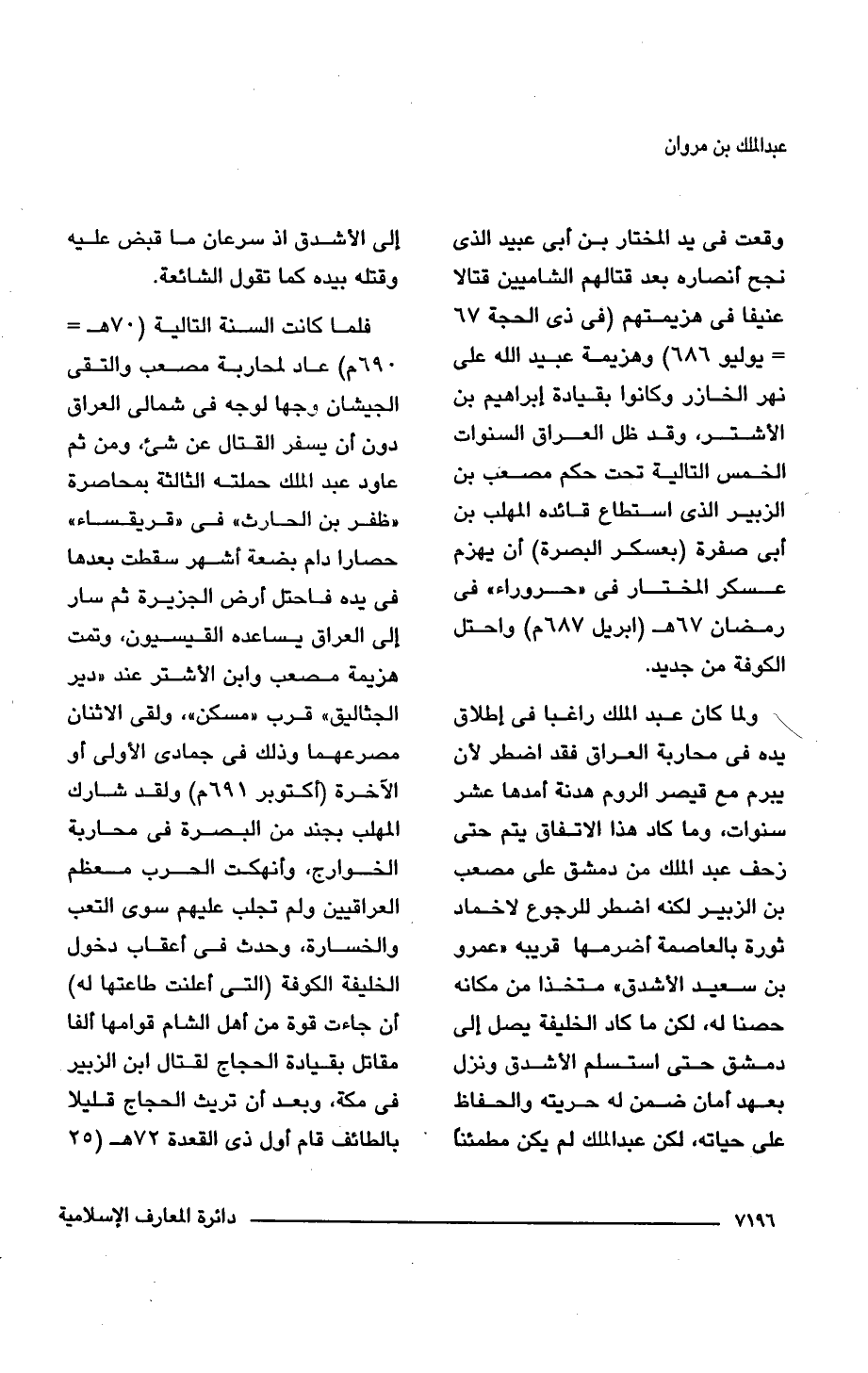 فلما كانت السنة التالية (70 هـ = 690 م) عاد لمحاربة مصعب والتقى الجيشان وجها لوجه فى شمالى العراق دون أن يسفر القتال عن شئ، ومن ثم عاود عبد الملك حملته الثالثة بمحاصرة "ظفر بن الحارث"فى "قريقساء" حصارا دام بضعة أشهر سقطت بعدها فى يده فاحتل أرض الجزيرة ثم سار إلى العراق يساعده القيسيون، وتمت هزيمة مصعب وابن الأشتر عند "دير الجثاليق" قرب "مسكن"، ولقى الاثنان مصرعهما وذلك فى جمادى الأولى أو الآخرة (أكتوبر 691 م) ولقد شارك المهلب بجند من البصرة فى محاربة الخوارج، وأنهكت الحرب معظم العراقيين ولم تجلب عليهم سوى التعب والخسارة، وحدث فى أعقاب دخول الخليفة الكوفة (التى اعلنت طاعتها له) أن جاءت قوة من أهل الشام قوامها ألفا مقاتل بقيادة الحجاج لقتال ابن الزبير فى مكة، وبعد أن تريث الحجاج قليلا بالطائف قام أول ذى القعدة 72 هـ (25