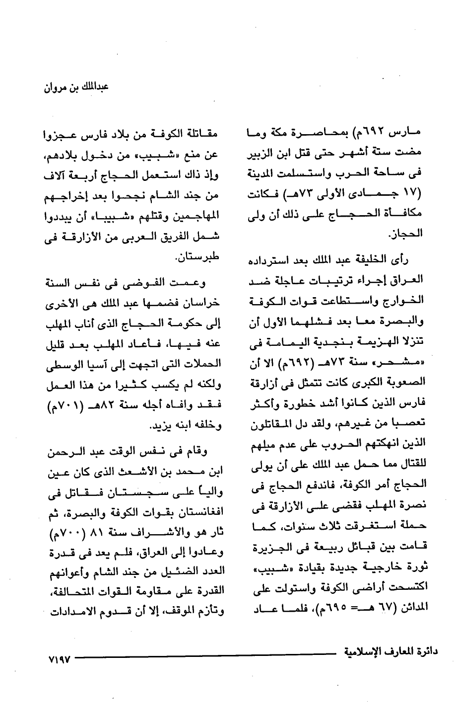 رأى الخليفة عبد الملك بعد استرداده العراق إجراء ترتيبات عاجلة ضد الخوارج واستطاعت قوات الكوفة والبصرة معا بعد فشلهما الأول أن تنزلا الهزيمة بنجدية اليمامة فى "مشحر" سنة 73 هـ (692 م) إلا أن الصعوبة الكبرى كانت تتمثل فى أزارقة فارس الذين كانوا أشد خطورة وأكثر تعصبا من غيرهم، ولقد دل المقاتلون الذين انهكتهم الحروب على عدم ميلهم للقتال مما حمل عبد الملك على أن يولى الحجاج أمر الكوفة، فاندفع الحجاج فى نصرة المهلب فقضى على الأزارقة فى حملة استغرقت ثلاث سنوات، كما قامت بين قبائل ربيعة فى الجزيرة ثورة خارجية جديدة بقيادة "شبيب" اكتسحت أراضى الكوفة واستولت على المدائن (67 هـ = 695 م)، فلما عاد مقاتلة الكوفة من بلاد فارس عجزوا عن منع "شبيب" من دخول بلادهم، وإذ ذاك استعمل الحجاج أربعة آلاف من جند الشام نجحوا بعد إخراجهم المهاجمين وقتلهم "شبيبا" أن يبددوا شمل الفريق العربى من الأزارقة فى طبرستان.