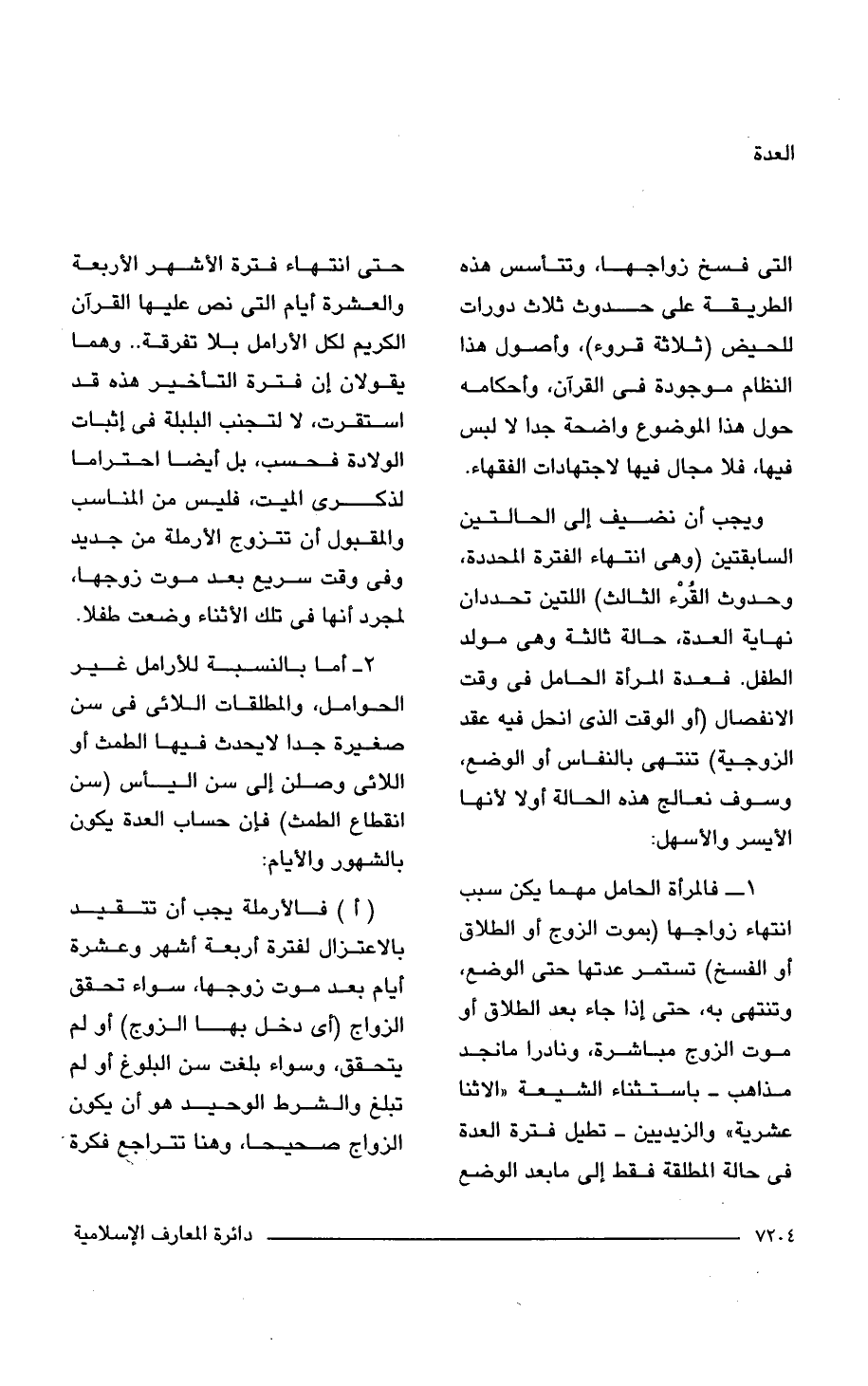 1 - فالمرأة الحامل مهما يكن سبب انتهاء زواجها (بموت الزوج أو الطلاق أو الفسخ) تستمر عدتها حتى الوضع، وتنتهى به، حتى إذا جاء بعد الطلاق أو موت الزوج مباشرة، ونادرا ما نجد مذاهب -باستثناء الشيعة "الاثنا عشرية" والزيديين- تطيل فترة العدة فى حالة المطلقة فقط إلى ما بعد الوضع حتى انتهاء فترة الأشهر الأربعة والعشرة أيام التى نص عليها القرآن الكريم لكل الأرامل بلا تفرقة. . وهما يقولان إن فترة التأخير هذه قد استقرت، لا لتجنب البلبلة فى إثبات الولادة فحسب، بل أيضا احتراما لذكرى الميت، فليس من المناسب والمقبول أن تتزوج الأرملة من جديد وفى وقت سريع بعد موت زوجها، لمجرد أنها فى تلك الأثناء وضعت طفلا.