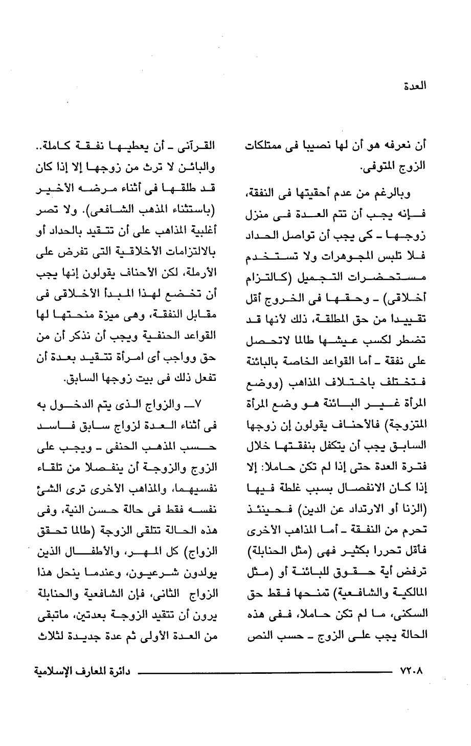 7 - والزواج الذى يتم الدخول به فى أثناء العدة لزواج سابق فاسد حسب المذهب الحنفى -ويجب على الزوج والزوجة أن ينفصلا من تلقاء نفسيهما، والمذاهب الأخرى ترى الشئ نفسه فقط فى حالة حسن النية، وفى هذه الحالة تتلقى الزوجة (طالما تحقق الزواج) كل المهر، والأطفال الذين يولدون شرعيون، وعندما ينحل هذا الزواج الثانى، فإن الشافعية والحنابلة يرون أن تتقيد الزوجة بعدتين، ما تبقى من العدة الأولى ثم عدة جديدة لثلاث