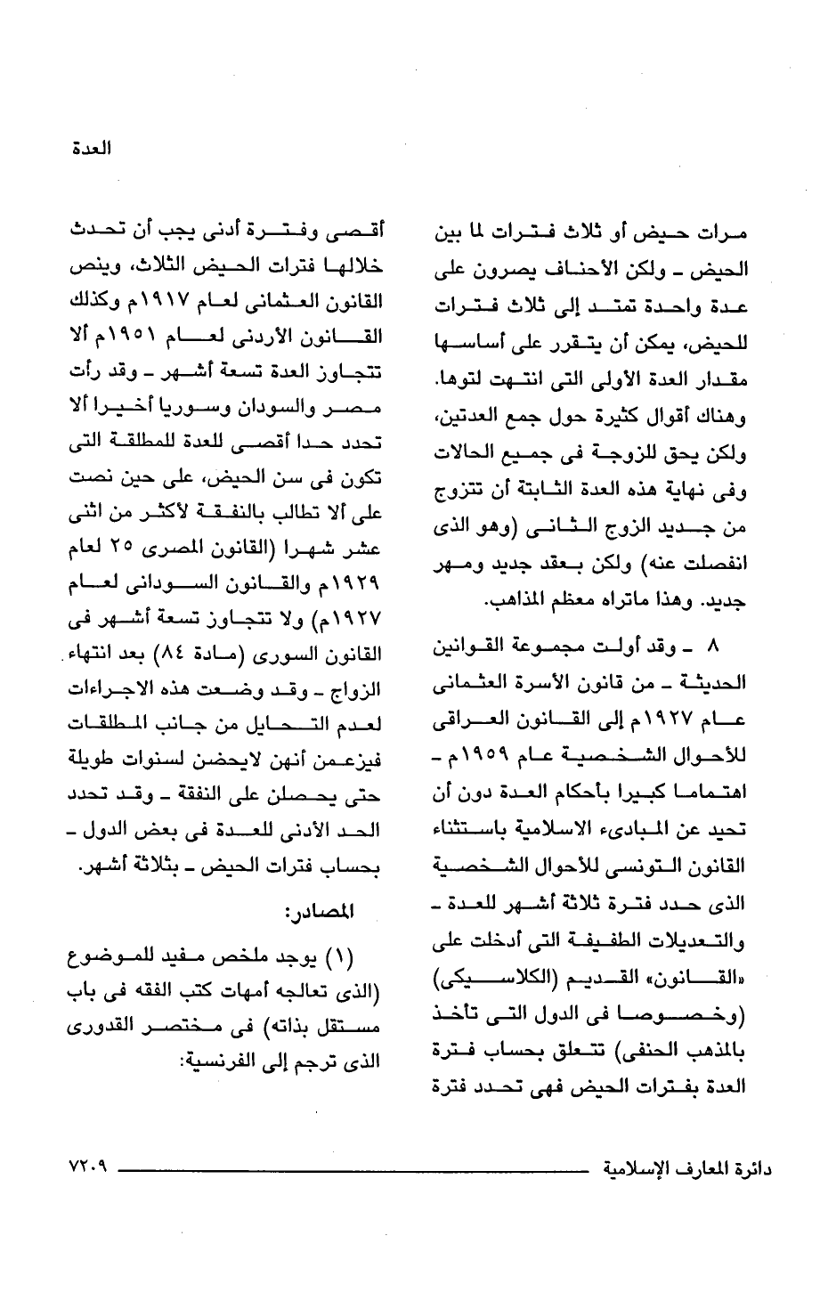 8 - وقد أولت مجموعة القوانين الحديثة -من قانون الأسرة العثمانى عام 1937 م إلى القانون العراقى للأحوال الشخصية عام 1959 م- اهتماما كبيرا بأحكام العدة دون أن تحيد عن المبادئ الإسلامية باستثناء القانون التونسى للأحوال الشخصية الذى حدد فترة ثلاثة أشهر للعدة -والتعديلات الطفيفة التى أدخلت على "القانون" القديم (الكلاسيكى) (وخصوصا فى الدول التى تأخذ بالمذهب الحنفى) تتعلق بحساب فترة العدة بفترات الحيض فهى تحدد فترة أقصى وفترة أدنى يجب أن تحدث خلالها فترات الحيض الثلاث، وينص القانون العثمانى لعام 1917 م وكذلك القانون الأردنى لعام 1951 م ألا تتجاوز العدة تسعة أشهر- وقد رأت مصر والسودان وسوريا أخيرا ألا تحدد حدا أقصى للعدة للمطلقة التى تكون فى سن الحيض، على حين نصت على ألا تطالب بالنفقة لأكثر من اثنى عشر شهرا (القانون المصرى 25 لعام 1929 م والقانون السودانى لعام 1927 م) ولا تتجاوز تسعة أشهر فى القانون السورى (مادة 84) بعد انتهاء. الزواج -وقد وضعت هذه الاجراءات لعدم التحايل من جانب المطلقات فيزعمن أنهن لا يحضن لسنوات طويلة حتى يحصلن على النفقة- وقد تحدد الحد الأدنى للعدة فى بعض الدول -بحساب فترات الحيض- بثلاثة أشهر.