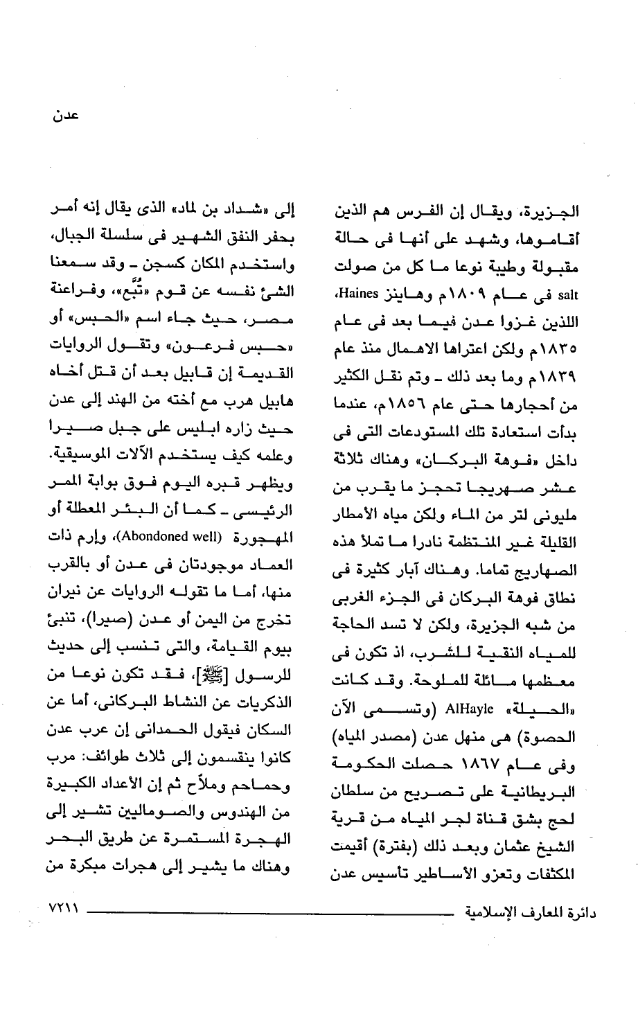 الجزيرة، ويقال إن الفرس هم الذين أقاموها، وشهد على أنها فى حالة مقبولة وطيبة نوعا ما كل من صولت salt فى 1809 م وهاينز Haines، اللذين غزوا عدن فيما بعد فى عام 1835 م ولكن اعتراها الاهمال منذ عام 1839 م وما بعد ذلك -وتم نقل الكثير من أحجارها حتى عام 1856 م، عندما بدأت استعادة تلك المستودعات التى فى داخل "فوهة البركان" وهناك ثلاثة عشر صهريجا تحجز ما يقرب من مليونى لتر من الماء ولكن مياه الأمطار القليلة غير المنتظمة نادرا ما تملأ هذه الصهاريج تماما. وهناك آبار كثيرة فى نطاق فوهة البركان فى الجزء الغربى من شبه الجزيرة، ولكن لا تسد الحاجة للمياه النقية للشرب، إذ تكون فى معظمها مائلة للملوحة. وقد كانت "الحيلة" Alhayle (وتسمى الآن الحصوة) هى منهل عدن (مصدر المياه) وفى عام 1867 حصلت الحكومة البريطانية على تصريح من سلطان لحج بشق قناة لجر المياه من قرية الشيخ عثمان وبعد ذلك (بفترة) أقيمت المكثفات وتعزو الأساطير تأسيس عدن إلى "شداد بن لماد" الذى يقال إنه أمر بحفر النفق الشهير فى سلسلة الجبال، واستخدم المكان كسجن- وقد سمعنا الشئ نفسه عن قوم "تُبَّع"، وفراعنة مصر، حيث جاء اسم "الحبس" أو "حبس فرعون" وتقول الروايات القديمة إن قابيل بعد أن قتل أخاه هابيل هرب مع أخته من الهند إلى عدن حيث زاره إبليس على جبل صيرا وعلمه كيف يستخدم الآلات الموسيقية. ويظهر قبره اليوم فوق بوابة الممر الرئيسى- كما أن البئر المعطلة أو المهجورة (Abondoned well)، وإرم ذات العماد موجودتان فى عدن أو بالقرب منها، أما ما تقوله الروايات عن نيران تخرج من اليمن أو عدن (صيرا)، تنبئ بيوم القيامة، والتى تنسب إلى حديث للرسول [-صلى اللَّه عليه وسلم-]، فقد تكون نوعا من الذكريات عن النشاط البركانى، أما عن السكان فيقول الحمدانى إن عرب عدن كانوا ينقسمون إلى ثلاث طوائف: مرب وحماحم وملّاح ثم إن الأعداد الكبيرة من الهندوس والصوماليين تشير إلى الهجرة المستمرة عن طريق البحر وهناك ما يشير إلى هجرات مبكرة من