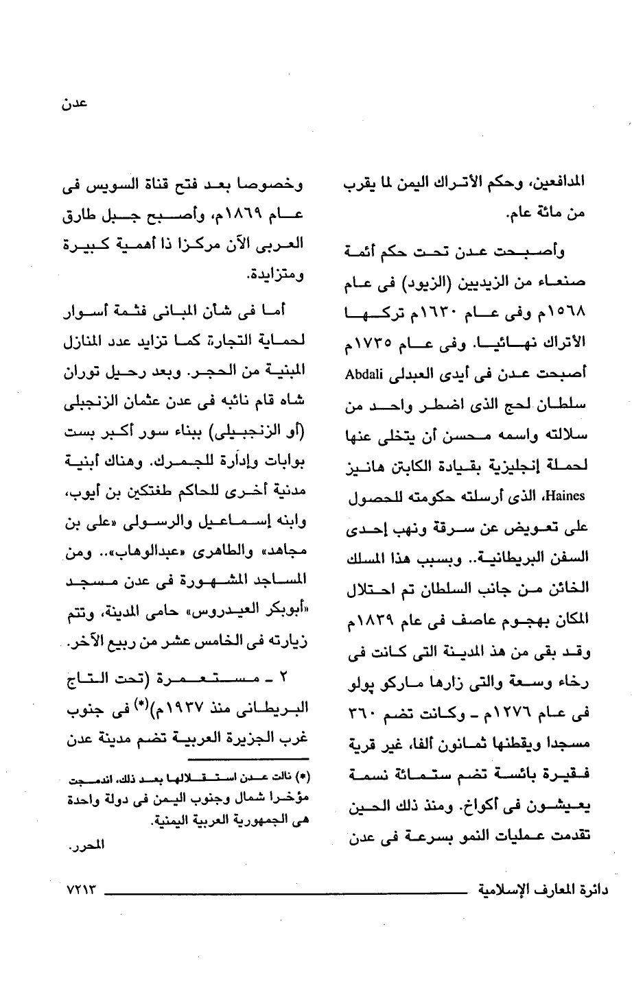 وأصبحت عدن تحت حكم أئمة صنعاء من الزيديين (الزيود) فى عام 1568 م وفى عام 1630 م تركها الأتراك نهائيا. وفى عام 1735 م أصبحت عدن فى أيدى العبدلى Abdali سلطان لحج الذى اضطر واحد من سلالته واسمه محسن أن يتخلى عنها لحملة إنجليزية بقيادة الكابتن هانيز Haines، الذى أرسلته حكومته للحصول على تعويض عن سرقة ونهب إحدى السفن البريطانية. . وبسبب هذا المسلك الخائن من جانب السلطان تم احتلال المكان بهجوم عاصف فى 1839 م وقد بقى من هذ المدينة التى كانت فى رخاء وسعة والتى زارها ماركو بولو فى عام 1276 م - وكانت تضم 360 مسجدا ويقطنها ثمانون ألفا، غير قرية فقيرة بائسة تضم ستمائة نسمة يعيشون فى أكواخ. ومنذ ذلك الحين تقدمت عمليات النمو بسرعة فى عدن وخصوصا بعد فتح قناة السويس فى عام 1896 م، وأصبح جبل طارق العربى الآن مركزا ذا أهمية كبيرة ومتزايدة.