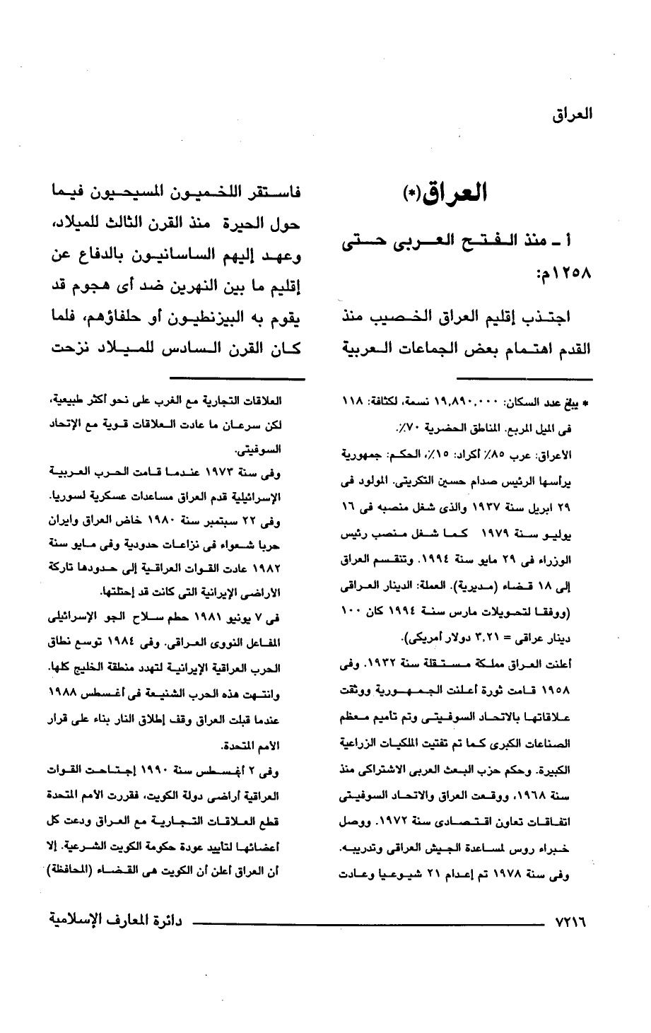 الأعراق: عرب 85 % أكراد: 15 %، الحكم: جمهورية يرأسها الرئيس صدام حسين التكريتى. المولود فى 29 ابريل سنة 1937 والذى شغل منصبه فى 16 يوليو سنة 1979 كما شغل منصب رئيس الوزراء فى 29 مايو سنة 1994. وتنقسم العراق إلى 18 قضاه (مديرية). العملة: الدينار العراقى (ووفقا لتحويلات مارس سنة 1994 كان 100 دينار عراقى = 3.21 دولار أمريكى).