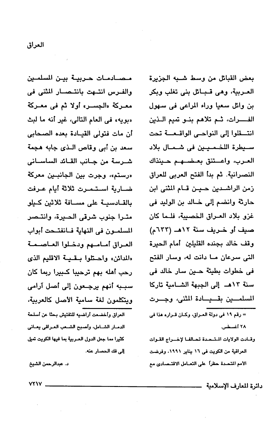 بعض القبائل من وسط شبه الجزيرة العربية، وهى قبائل بنى تغلب وبكر بن وائل سعيا وراء المراعى فى سهول الفرات، ثم تلاهم بنو تميم الذين انتقلوا إلى النواحى الواقعة تحت سيطرة اللخميين فى شمال بلاد العرب، واعتنق بعضهم حينذاك النصرانية. ثم بدأ الفتح العربى للعراق زمن الراشدين حين قام المثنى ابن حارثة وانضم إلى خالد بن الوليد فى غزو بلاد العراق الخصيبة، فلما كان صيف أو خريف سنة 12 هـ (633 م) وقف خالد بجنده القليلين أمام الحيرة التى سرعان ما دانت له، وسار الفتح فى خطوات بطيئة حين سار خالد فى سنة 13 هـ إلى الجبهة الشامية تاركا المسلمين بقيادة المثنى، وجرت مصادمات حربية بين المسلمين والفرس انتهت بانتصار المثنى فى معركة "الجسر" أولا ثم فى معركة "بويه" فى العام التالى، غير أنه ما لبث أن مات فتولى القيادة بعده الصحابى سعد بن أبى وقاص الذى جابه هجمة شرسة من جانب القائد الساسانى "رستم"، وجرت بين الجانبين معركة ضارية استمرت ثلاثة أيام عرفت بالقادسية على مسافة ثلاثين كيلو مترا جنوب شرقى الحيرة، وانتصر المسلمون فى النهاية فانفتحت أبواب العراق أمامهم ودخلوا العاصمة "المدائن" واحملوا بقية الإقليم الذى رحب أهله بهم ترحيبا كبيرا ربما كان سببه أنهم يرجعون إلى أصل آرامى ويتكلمون لغة سامية الأصل كالعربية،