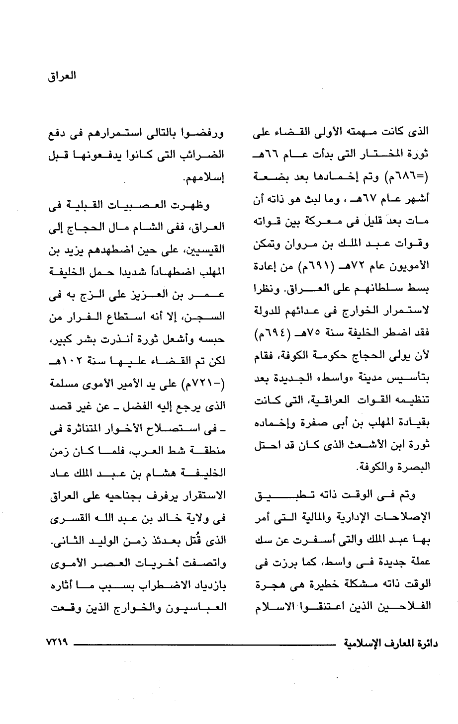 وظهرت العصبيات القبلية فى العراق، ففى الشام مال الحجاج إلى القيسيين، على حين اضطهدهم يزيد بن المهلب اضطهادًا شديدا حمل الخليفة عمر بن العزيز على الزج به فى السجن، إلا أنه استطاع الفرار من حبسه وأشعل ثورة أنذرت بشر كبير، لكن تم القضاء عليها سنة 102 هـ (721 م) على يد الأمير الأموى مسلمة الذى يرجع إليه الفضل -عن غير قصد- فى استصلاح الأخوار المتناثرة فى منطقة شط العرب، فلما كان زمن الخليفة هشام بن عبد الملك عاد الاستقرار يرفرف بجناحيه على العراق فى ولاية خالد بن عبد اللَّه القسرى الذى قُتل بعدئذ زمن الوليد الثانى. واتصفت أخريات العصر الأموى بازدياد الاضطراب بسبب ما أثاره العباسيون والخوارج الذين وقعت