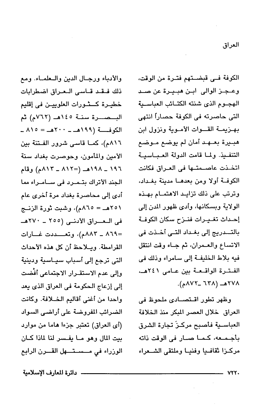الكوفة فى قبضتهم فترة من الوقت، وعجز الوالى ابن هبيرة عن صد الهجوم الذى شنته الكتائب العباسية التى حاصرته فى الكوفة حصارًا انتهى بهزيمة القوات الأموية ونزول ابن هبيرة بعهد أمان لم يوضع موضع التنفيذ. ولما قامت الدولة العباسية اتخذت عاصمتها فى العراق فكانت الكوفة أولا ومن بعدها مدينة بغداد، وترتب على ذلك تزايد الاهتمام بهذه الولاية وبسكانها، وأدى ظهور المدن إلى إحداث تغيرات فنزح سكان الكوفة بالتدريج إلى بغداد التى أخذت فى الاتساع والعمران، ثم جاء وقت انتقل فيه بلاط الخليفة إلى سامراء وذلك فى الفترة الواقعة بين عامى 241 هـ، 278 هـ (638 - 872 م)