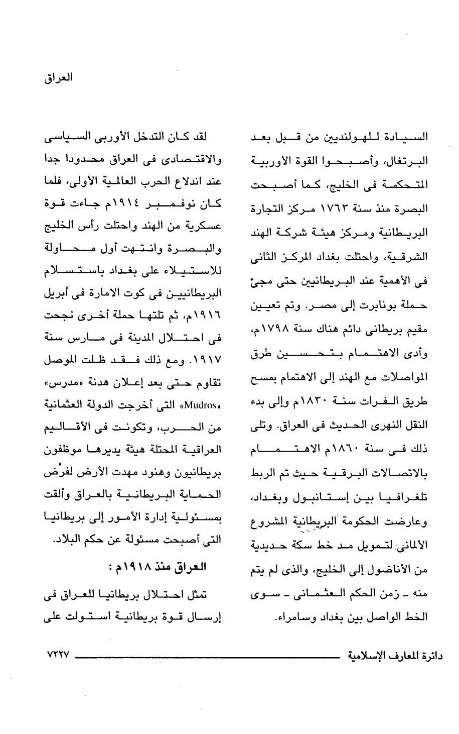 لقد كان التدخل الأوربى السياسى والاقتصادى فى العراق محدودا جدا عند اندلاع الحرب العالمية الأولى، فلما كان نوفمبر 1914 م جاءت قوة عسكرية من الهند واحتلت رأس الخليج والبصرة وانتهت أول محاولة للاستيلاء على بغداد باستسلام البريطانيين فى كوت الامارة فى إبريل 1916 م، ثم تلتها حملة أخرى نجحت فى احتلال المدينة فى مارس سنة 1917. ومع ذلك فقد ظلت الموصل تقاوم حتى بعد إعلان هدنة "مدرس" " Mudros" التى أخرجت الدولة العثمانية من الحرب، وتكونت فى الأقاليم العراقية المحتلة هيئة يديرها موظفون بريطانيون وهنود مهدت الأرض لفرْض الحماية البريطانية بالعراق وألقت بمسئولية إدارة الأمور إلى بريطانيا التى أصبحت مسئولة عن حكم البلاد.