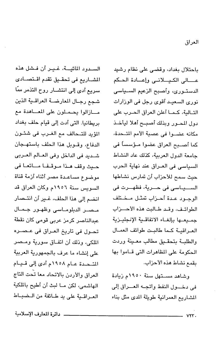 وشاهد مستهل سنة 1950 م زيادة فى دخول النفط واتجه العراق إلى المشاريع العمرانية طويلة المدى مثل بناء السدود المائية، غير أن فشل هذه المشاريع فى تحقيق تقدم اقتصادى سريع أدى إلى انتشار روح التذمر ممّا شجع رجال المعارضة العراقية الذين ما زالوا يحملون على المعاهدة مع بريطانيا. التى أدت إلى قيام حلف بغداد المؤيد للتحالف مع الغرب فى شئون الدفاع، وقوبل هذا الحلف باستهجان شديد فى الداخل وفى العالم العربى حيث وقف هذا موقفا مائعا فى موضوع مساعدة مصر أثناء أزمة قناة السويس سنة 1956 م وكان العراق قد انضم إلى هذا الحلف، غير أن انتصار مصر الدبلوماسى وظهور جمال عبد الناصر كرمز عربى قومى كان نقطة تحول فى تاريخ العراق فى عصره الملكى، وذلك أن اتفاق سورية ومصر على إنشاء ما عرف بالجمهورية العربية المتحدة عام 1958 م أدى إلى قيام العراق والأردن بالاتحاد معا تحت التاج الهاشمى، لكن ما لبث أن أطيح بالملكية العراقية على يد طائفة من الضباط