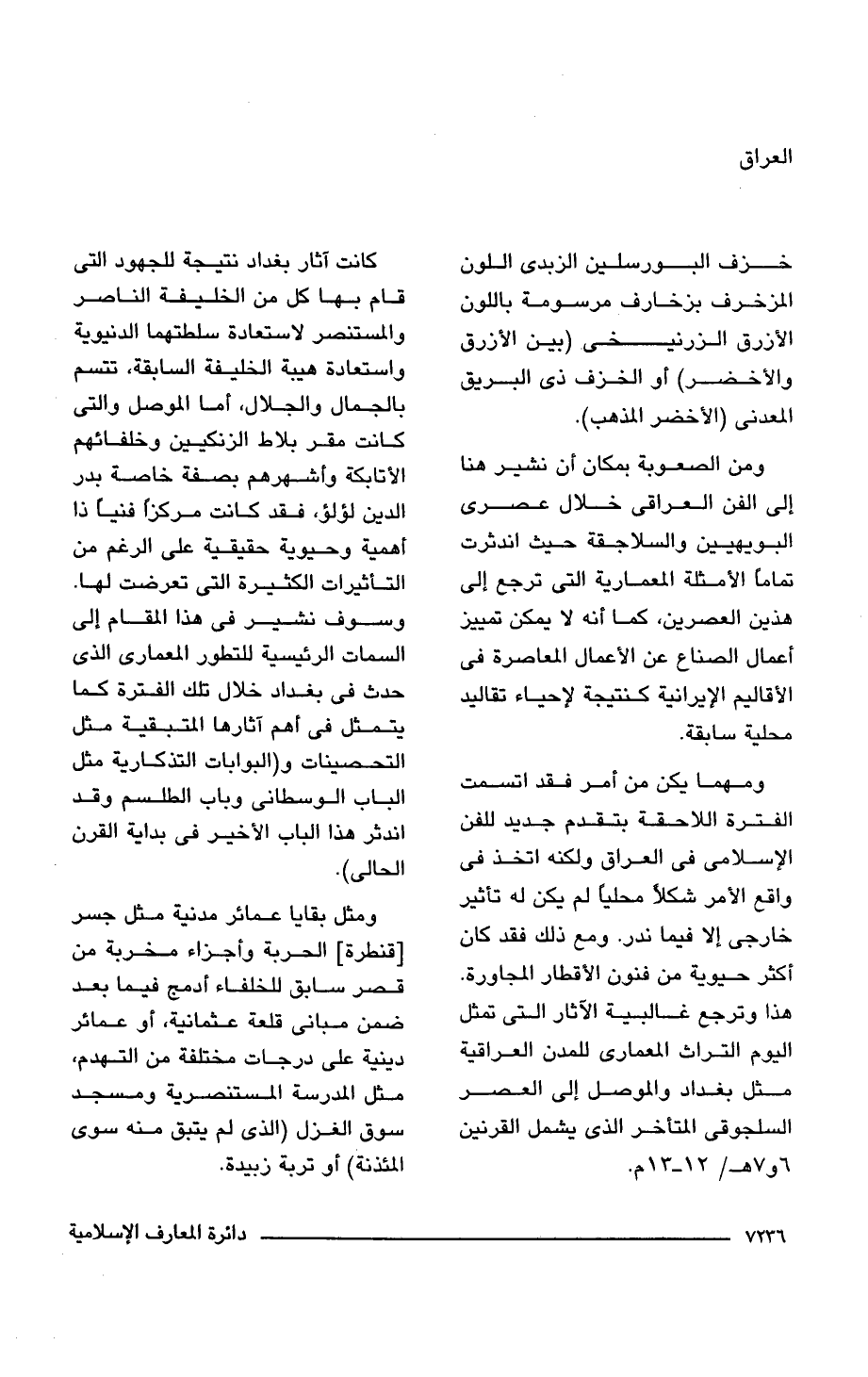 ومن الصعوبة بمكان أن نشير هنا إلى الفن العراقى خلال عصرى البويهيين والسلاجقة حيث اندثرت تمامًا الأمثلة المعمارية التى ترجع إلى هذين العصرين، كما أنه لا يمكن تمييز أعمال الصناع عن الأعمال المعاصرة فى الأقاليم الإيرانية كنتيجة لإحياء تقاليد محلية سابقة.