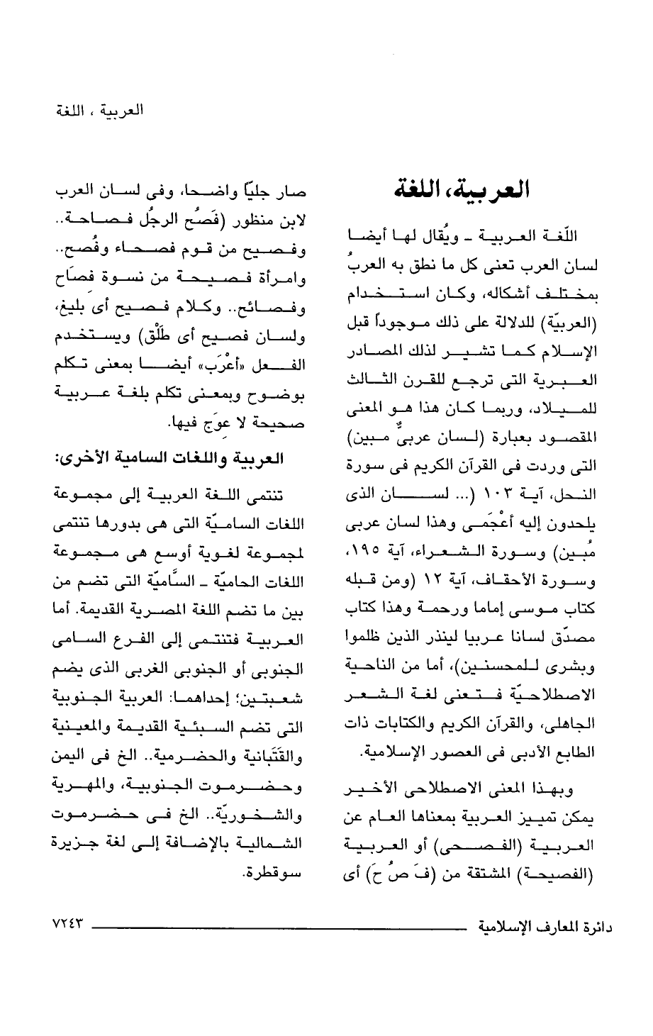 وبهذا المعنى الاصطلاحى الأخير يمكن تمييز العربية بمعناها العام عن العربية (الفصحى) أو العربية (الفصيحة) المشتقة من (فَ صُ حَ) أى صار جليًّا واضحا، وفى لسان العرب لابن منظور (فَصُح الرجُل فصاحة. . وفصيح من قوم فصحاء وفُصح. . وامرأة فصيحة من نسوة فصَاح وفصائح. . وكلام فصيح أى بليغ، ولسان فصيح أى طَلْق) ويستخدم الفعل "أعْرَب" أيضا بمعنى تكلم بوضوح وبمعنى تكلم بلغة عربية صحيحة لا عِوَج فيها.