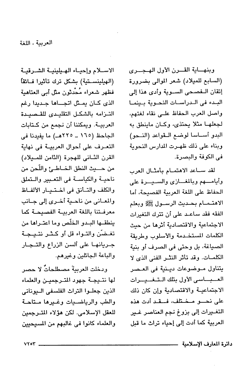 لقد ساعد الاهتمام بأمثال العرب وأيامهم وبالمغازى والسيرة على الحفاظ على اللغة العربية الفصيحة، أما الاهتمام بحديث الرسول -صلى اللَّه عليه وسلم- وبعلم الفقه فقد ساعد على أن تترك التغيرات الاجتماعية والاقتصادية أثرها من حيث الكلمات المستخدمة والأسلوب وطريقة الصياغة، بل وحتى فى الصرف أو بنية الكلمات. وقد تأثر النثر الفنى الذى لا يتناول موضوعات دينية فى العصر العباسى الأول بتلك التغيرات الاجتماعية والاقتصادية وإن كان ذلك على نحو مختلف، فقد أدت هذه التغيرات إلى بزوغ نجم العناصر غير العربية كما أدت إلى إحياء تراث ما قبل الإسلام وإحياء الهيلينية الشرقية (الهيلينستية) بشكل ترك تأثيرا فائقًا فظهر شعراء مُحْدثون مثل أبى العتاهية الذى كان يمثل اتجاها جديدا رغم التزامه بالشكل التقليدى للقصيدة العربية. ويمكننا أن نجمع من كتابات الجاحظ (165 - 225 هـ) ما يفيدنا فى التعرف على أحوال العربية فى نهاية القرن الثانى للهجرة (الثامن للميلاد) من حيث النطق الخاطئ واللّحن من ناحية والكياسة فى التعبير والتملق والكلف والتأنق فى اختيار الألفاظ والمعانى من ناحية أخرى إلى جانب معرفتنا باللغة العربية الفصيحة كما ينطقها البدو الخفص وما اعتراها من تغضّن والتواء قل أو كثر نتيجة جريانها على ألسن الزراع والتجار والباعة الجائلين وغيرهم.