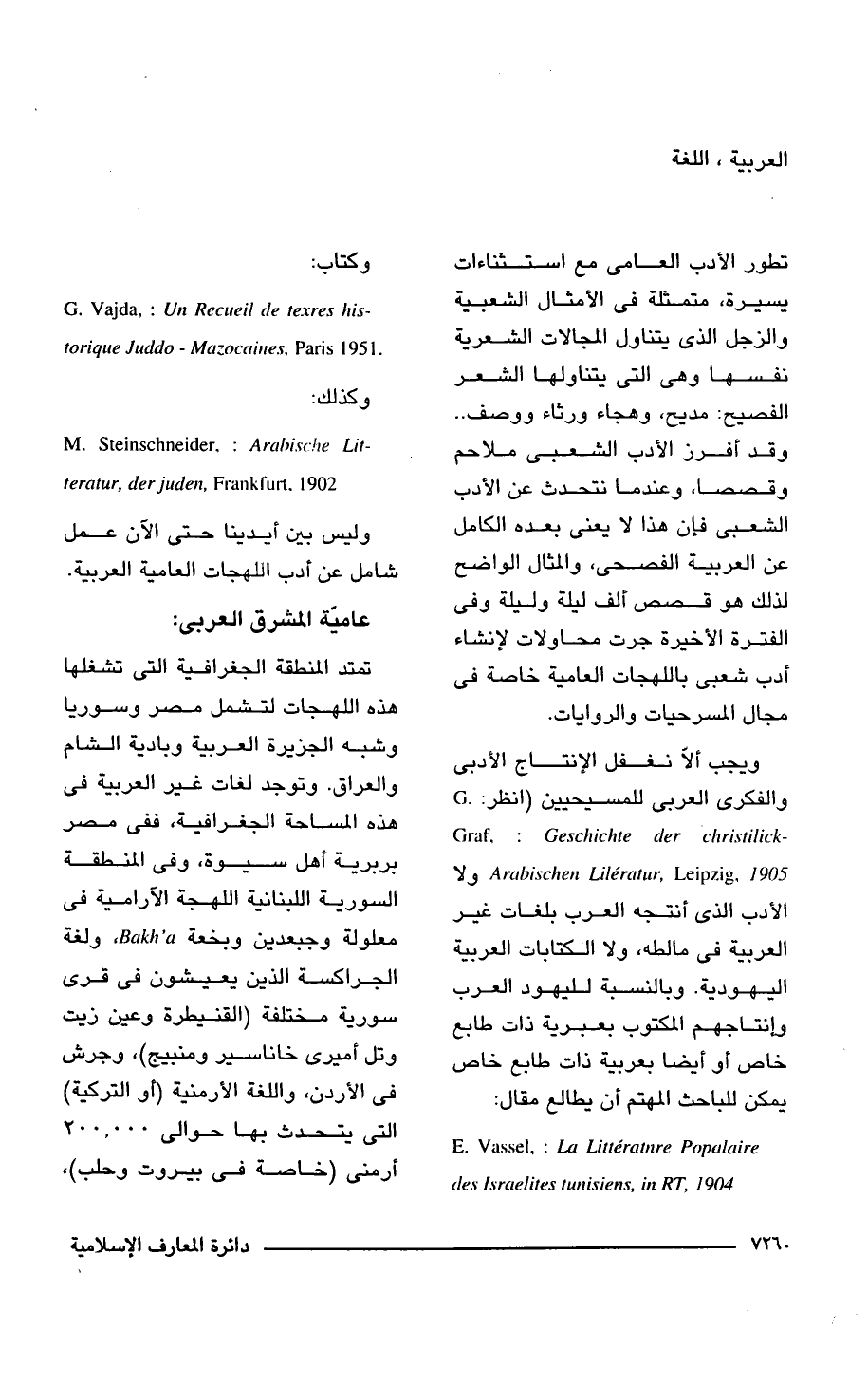 ويجب ألّا نغفل الإنتاج الأدبى والفكرى العربى للمسيحيين (انظر: G.Graf,: Geschichte der christilick Arabischen Lileratur Leipzig 1905 ولا الأدب الذى أنتجه العرب بلغات غير العربية فى مالطه، ولا الكتابات العربية اليهودية. وبالنسبة لليهود العرب وإنتاجهم المكتوب بعبرية ذات طابع خاص أو أيضا بعربية ذات طابع خاص يمكن للباحث المهتم أن يطالع مقال: E. Vassel,: La Litteratnre Popalaire des Israelites tunisiens. in RT, 1904