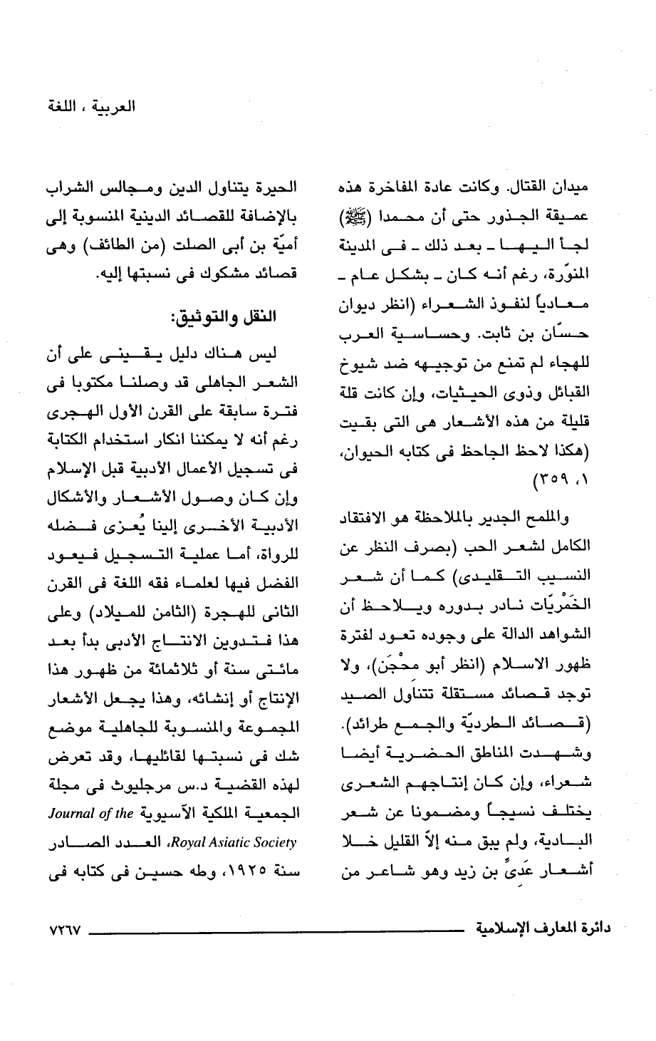 ميدان القتال. وكانت عادة المفاخرة هذه عميقة الجذور حتى أن محمدا -صلى اللَّه عليه وسلم- لجأ اليها -بعد ذلك- فى المدينة المنوّرة، رغم أنه كان -بشكل عام- معاديًا لنفوذ الشعراء (انظر ديوان حسّان بن ثابت. وحساسية العرب للهجاء لم تمنع من توجيهه ضد شيوخ القبائل وذوى الحيثيات، وإن كانت قلة قليلة من هذه الأشعار هى التى بقيت (هكذا لاحظ الجاحظ فى كتابه الحيوان، 1، 359)