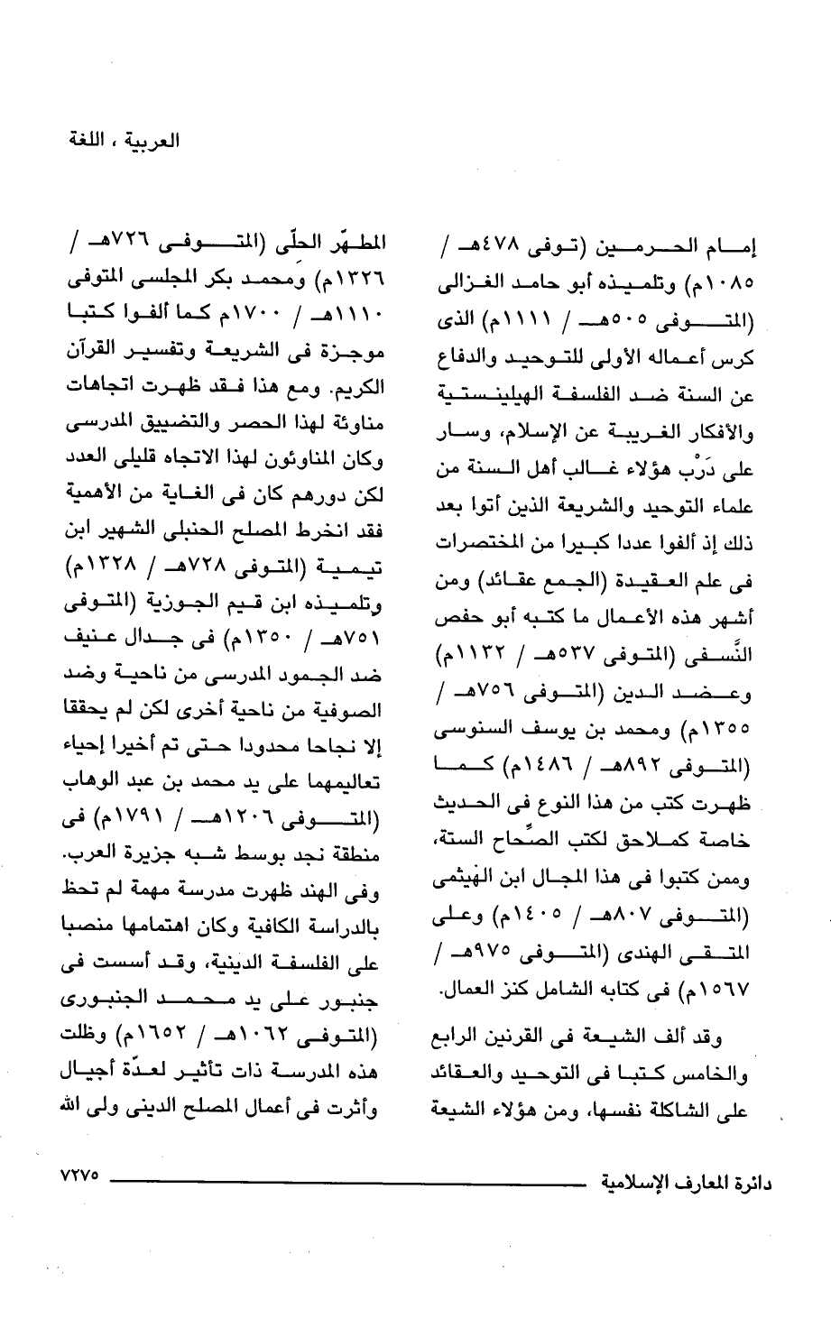 إمام الحرمين (توفى 478 هـ/ 1085 م) وتلميذه أبو حامد الغزالى (المتوفى 505 هـ/ 1111 م) الذى كرس أعماله الأولى للتوحيد والدفاع عن السنة ضد الفلسفة الهيلينستية والأفكار الغريبة عن الإسلام، وسار على دَرْب هؤلاء غالب أهل السنة من علماء التوحيد والشريعة الذين أتوا بعد ذلك إذ ألفوا عددا كبيرا من المختصرات فى علم العقيدة (الجمع عقائد) ومن أشهر هذه الأعمال ما كتبه أبو حفص النَّسفى (المتوفى 537 هـ/ 1132 م) وعضد الدين (المتوفى 756 هـ/ 1355 م) ومحمد بن يوسف السنوسى (المتوفى 892 هـ/ 1486 م) كما ظهرت كتب من هذا النوع فى الحديث خاصة كملاحق لكتب الصِّحاح الستة، وممن كتبوا فى هذا المجال ابن الهيثمى (المتوفى 807 هـ/ 1405 م) وعلى المتقى الهندى (المتوفى 975 هـ/ 1567 م) فى كتابه الشامل كنز العمال.