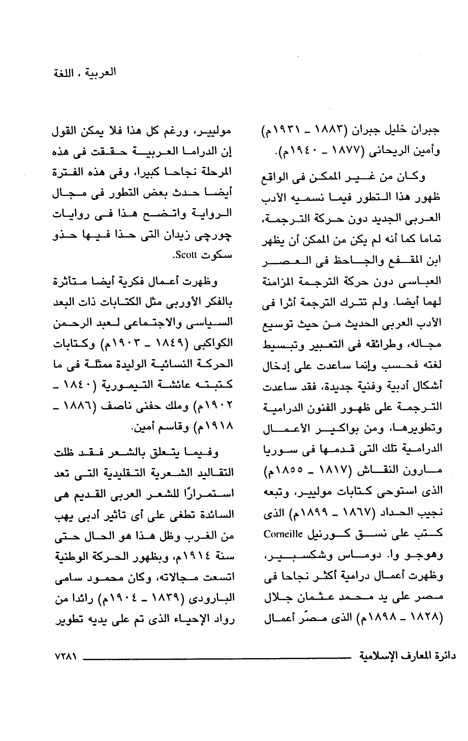 وكان من غير الممكن فى الواقع ظهور هذا التطور فيما نسميه الأدب العربى الجديد دون حركة الترجمة، نفاما كما أنه لم يكن من الممكن أن يظهر ابن المقفع والجاحظ فى العصر العباسى دون حركة الترجمة المزامنة لهما أيضا. ولم تترك الترجمة أثرا فى الأدب العربى الحديث من حيث توسيع مجاله، وطرائقه فى التعبير وتبسيط لغته فحسب وإنما ساعدت على إدخال أشكال أدبية وفنية جديدة، فقد ساعدت الترجمة على ظهور الفنون الدرامية وتطويرها، ومن بواكير الأعمال الدرامية تلك التى قدمها فى سوريا مارون النقاش (1817 - 1855 م) الذى استوحى كتابات موليير، وتبعه نجيب الحداد (1867 - 1899 م) الذى كتب على نسق كورنيل Corneille وهوجو وا. دوماس وشكسبير، وظهرت أعمال درامية أكثر نجاحا فى مصر على يد محمد عثمان جلال (1828 - 1898 م) الذى مصّر أعمال موليير، ورغم كل هذا فلا يمكن القول إن الدراما العربية حققت فى هذه المرحلة نجاحا كبيرا، وفى هذه الفترة أيضا حدث بعض التطور فى مجال الرواية واتضح هذا فى روايات جورجى زيدان التى حذا فيها حذو سكوت Scott.