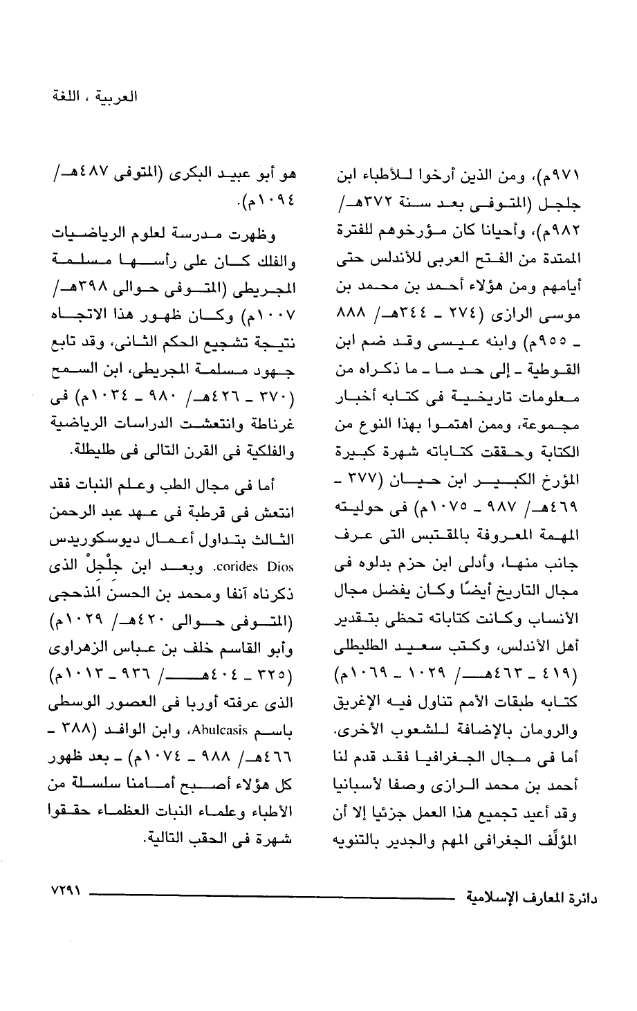 971 م)، ومن الذين أرخوا للأطباء ابن جلجل (المتوفى بعد سنة 372 هـ/ 982 م)، وأحيانا كان مؤرخوهم للفترة الممتدة من الفتح العربى للأندلس حتى أيامهم ومن هؤلاء أحمد بن محمد بن موسى الرازى (274 - 344 هـ/ 888 - 955 م) وابنه عيسى وقد ضم ابن القوطية -إلى حد ما- ما ذكراه من معلومات تاريخية فى كتابه أخبار مجموعة، وممن اهتموا بهذا النوع من الكتابة وحققت كتاباته شهرة كبيرة المؤرخ الكبير ابن حيان (377 - 469 هـ/ 987 - 1075 م) فى حوليته المهمة المعروفة بالمقتبس التى عرف جانب منها، وأدلى ابن حزم بدلوه فى مجال التاريخ أيضًا وكان يفضل مجال الأنساب وكانت كتاباته تحظى بتقدير أهل الأندلس، وكتب سعيد الطليطلى (419 - 463 هـ/ 1029 - 1069 م) كتابه طبقات الأمم تناول فيه الإغريق والرومان بالإضافة للشعوب الأخرى. أما فى مجال الجغرافيا فقد قدم لنا أحمد بن محمد الرازى وصفا لأسبانيا وقد أعيد تجميع هذا العمل جزئيا إلا أن المؤلِّف الجغرافى المهم والجدير بالتنويه هو أبو عبيد البكرى (المتوفى 487 هـ/ 1094 م).