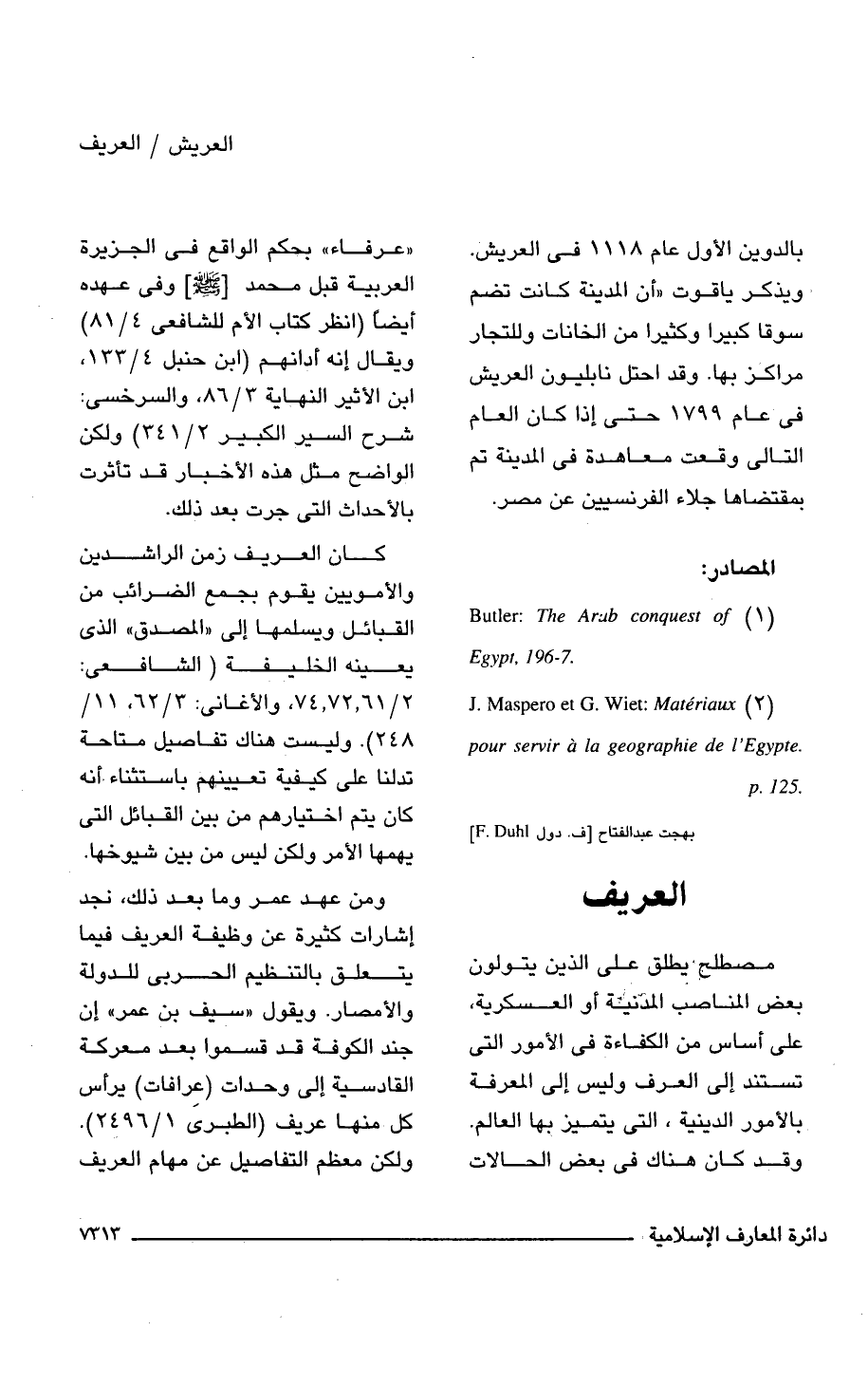 مصطلح يطلق على الذين يتولون بعض المناصب المدنية أو العسكرية، على أساس من الكفاءة فى الأمور التى تستند إلى العرف وليس إلى المعرفة بالأمور الدينية، التى يتميز بها العالم. وقد كان هناك فى بعض الحالات "عرفاء" بحكم الواقع فى الجزيرة العربية قبل محمد [-صلى اللَّه عليه وسلم-] وفى عهده أيضًا (انظر كتاب الأم للشافعى 4/ 81) ويقال إنه أدانهم (ابن حنبل 4/ 133، ابن الأثير النهاية 3/ 86، والسرخسى: شرح السير الكبير 2/ 341) ولكن الواضح مثل هذه الأخبار قد تأثرت بالأحداث التى جرت بعد ذلك.