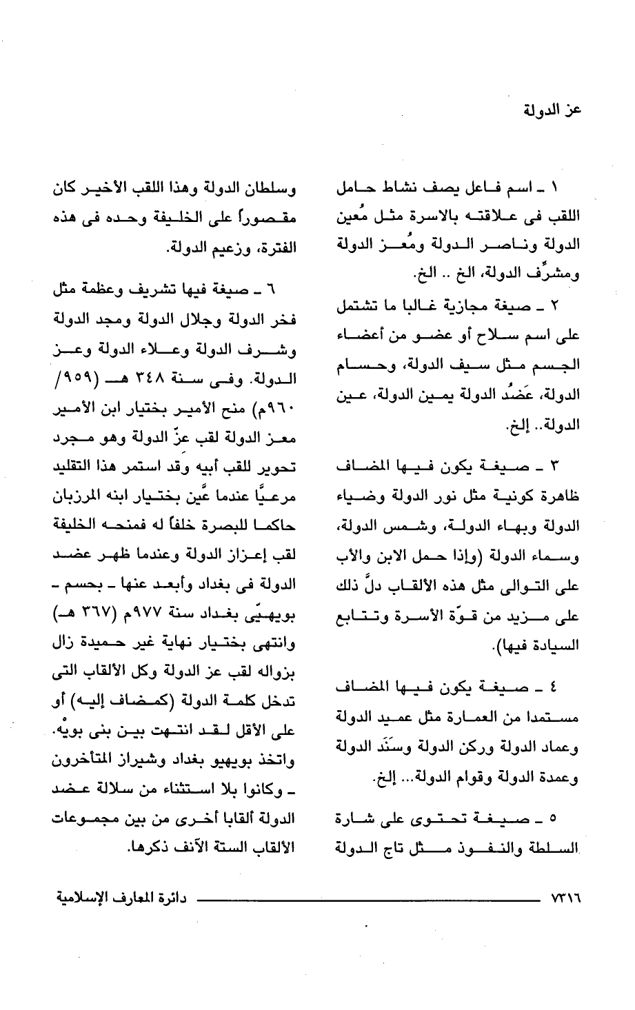 6 - صيغة فيها تشريف وعظمة مثل فخر الدولة وجلال الدولة ومجد الدولة وشرف الدولة وعلاء الدولة وعز الدولة. وفى سنة 348 هـ (959/ 960 م) منح الأمير بختيار ابن الأمير معز الدولة لقب عِزّ الدولة وهو مجرد تحوير للقب أبيه وقد استمر هذا التقليد مرعيَّا عندما عين بختيار ابنه المرزبان حاكما للبصرة خلفا له فمنحه الخليفة لقب إعزاز الدولة وعندما ظهر عضد الدولة فى بغداد وأبعد عنها -بحسم- بويهيّى بغداد سنة 977 م (367 هـ) وانتهى بختيار نهاية غير حميدة زال بزواله لقب عز الدولة وكل الألقاب التى تدخل كلمة الدولة (كمضاف إليه) أو على الأقل لقد انتهت بين بنى بويْه. واتخذ بويهيو بغداد وشيراز المتأخرون -وكانوا بلا استثناء من سلالة عضد الدولة ألقابا أخرى من بين مجموعات الألقاب الستة الآنف ذكرها.