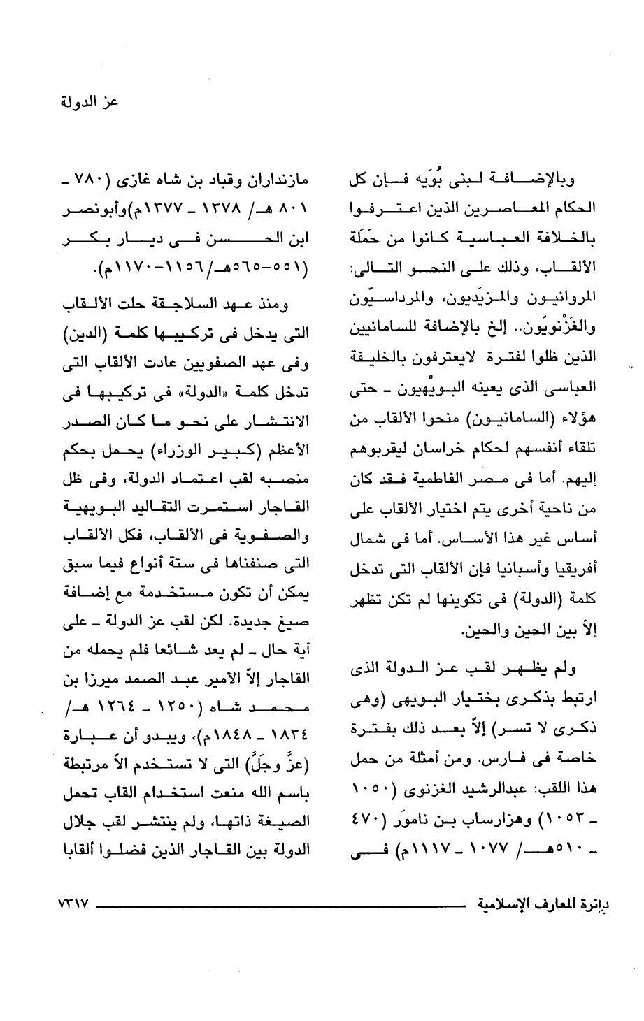 ولم يظهر لقب عز الدولة الذى ارتبط بذكرى بختيار البويهى (وهى ذكرى لا تسر) إلّا بعد ذلك بفترة خاصة فى فارس. ومن أمثلة من حمل هذا اللقب: عبد الرشيد الغزنوى (1050 - 1053) وهزارساب بن ناموَر (470 - 510 هـ/ 1077 - 1117 م) فى مازنداران وقباد بن شاه غازى (780 - 801 هـ/ 1378 - 1377 م) وأبو نصر ابن الحسن فى ديار بكر (551 - 565 هـ/ 1156 - 1170 م)