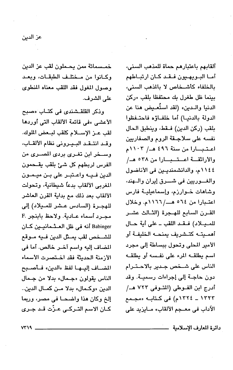 ألقابهم باعتبارهم حماة للمذهب السنى، أما البويهيون فقد كان ارتباطهم بالخلفاء كأشخاص لا بالمذهب السنى، بينما ظل طغرل بك محتفظا بلقب "ركن الدنيا والدين" (لقد استُعيض هنا عن الدولة بالدنيا) أما خلفاؤه فاحتفظوا بلقب (ركن الدين) فقط، وينطبق الحال نفسه على سلاجقة الروم والصفاريين اعتبارا من سنة 496 هـ/ 1103 م والأراثقة اعتبارا من 538 هـ/ 1144 م، والدانشمنديين فى الأناضول والغوريين فى شرق إيران والهند، وشاهات خوارزم، وإسماعيلية فارس اعتبارا من 564 هـ/ 1166 م. وخلال القرن السابع للهجرة (الثالث عشر للميلاد) فقد اللقب -على أية حال أهميته كتشريف يمنحه الخليفة أو الأمير المحلى وتحول ببساطة إلى مجرد اسم يطلقه المرء على نفسه أو يطلقه الناس على شخص جدير بالاحترام دون حاجة إلى إجراءات رسمية. وقد أدرج ابن الفوطى (المتوفى 723 هـ/ 1323 - 1324 م) فى كتابه "مجمع الآداب فى معجم الألقاب" ما يزيد على خمسمائة ممن يحملون لقب عز الدين وكانوا من مختلف الطبقات، وبعد وصول المغول فقد اللقب معناه المنطوى على الشرف.