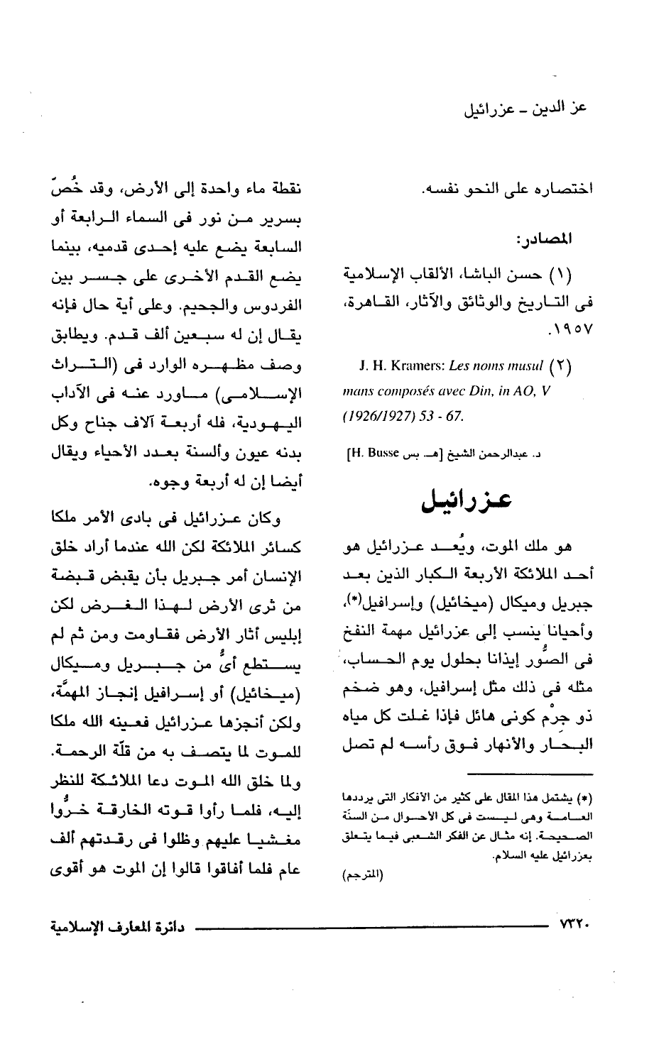 هو ملك الموت، ويُعد عزرائيل هو أحد الملائكة الأربعة الكبار الذين بعد جبريل وميكال (ميخائيل) وإسرافيل (*)، وأحيانا ينسب إلى عزرائيل مهمة النفخ فى الصُّور إيذانا بحلول يوم الحساب، مثله فى ذلك مثل إسرافيل، وهو ضخم ذو جِرْم كونى هائل فإذا غلت كل مياه البحار والأنهار فوق رأسه لم تصل نقطة ماء واحدة إلى الأرض، وقد خُصّ بسرير من نور فى السماء الرابعة أو السابعة يضع عليه إحدى قدميه، بينما يضع القدم الأخرى على جسر بين الفردوس والجحيم. وعلى أية حال فإنه يقال إن له سبعين ألف قدم. ويطابق وصف مظهره الوارد فى (التراث الإسلامى) ما ورد عنه فى الآداب اليهودية، فله أربعة آلاف جناح وكل بدنه عيون وألسنة بعدد الأحياء ويقال أيضا إن له أربعة وجوه.