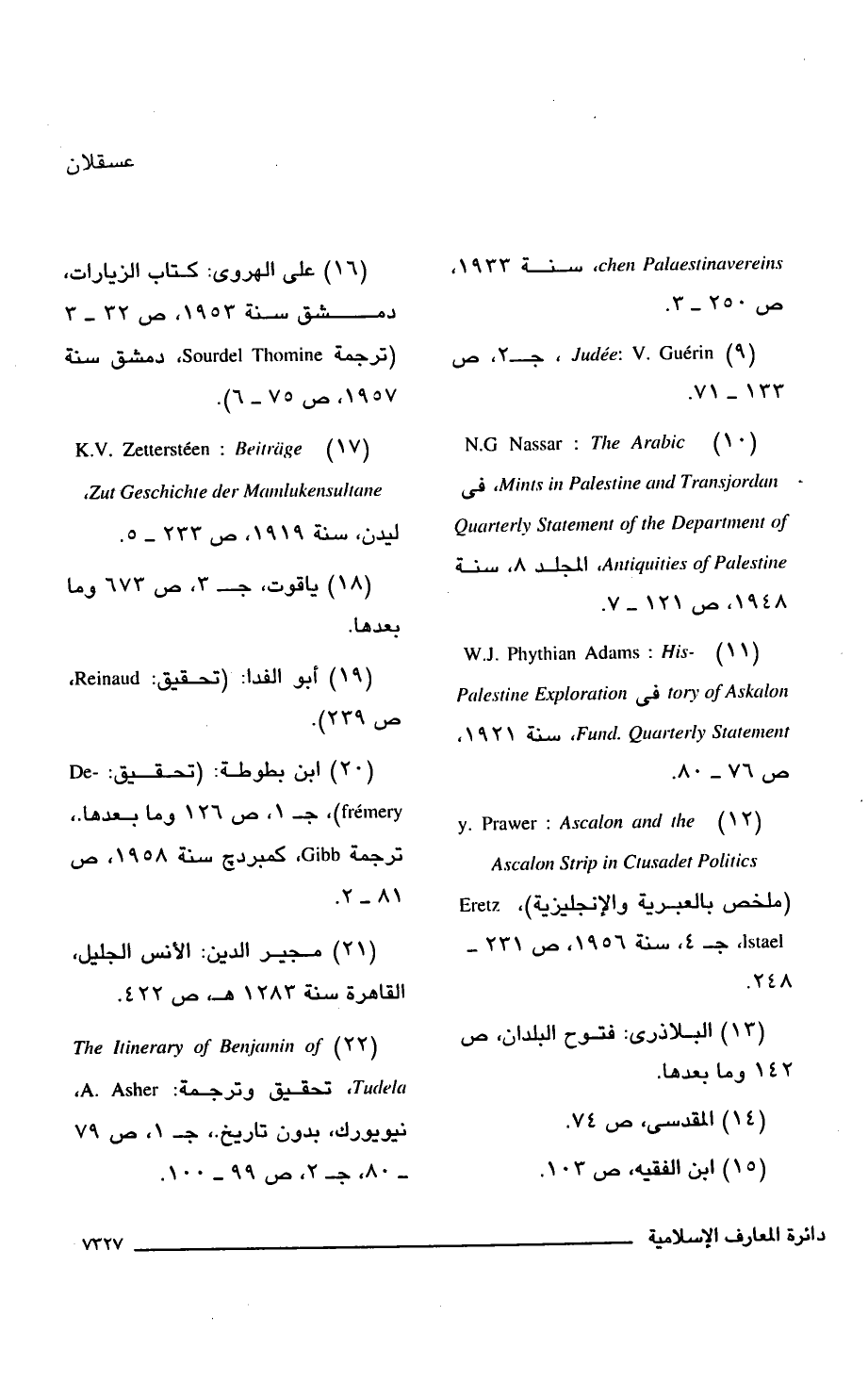 (11) W.J. Phythian Adams: History of Askalon فى Palestine Exploration Fund. Quarterly Statement، سنة 1921، ص 76 - 80.