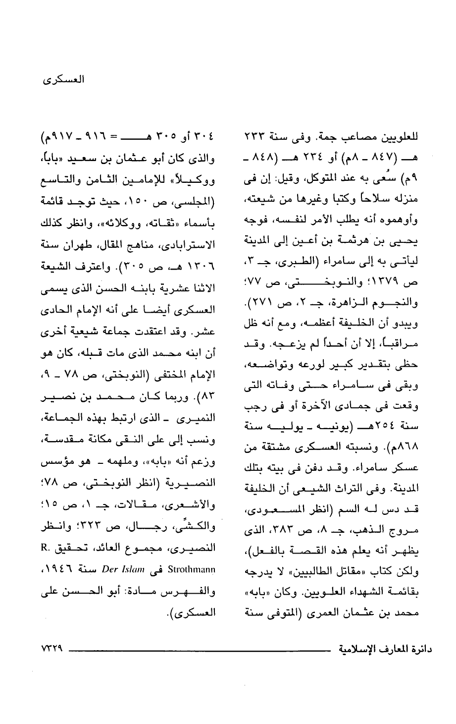 للعلويين مصاعب جمة. وفى سنة 233 هـ (848 - 8 م) أو 234 هـ (848 - 9 م) سُعى به عند المتوكل، وقيل: إن فى منزله سلاحًا وكتبا وغيرها من شيعته، وأوهموه أنه يطلب الأمر لنفسه، فوجه يحيى بن هرثمة بن أعين إلى المدينة ليأتى به إلى سامراء (الطبرى، جـ 3، ص 1379؛ والنوبختى، ص 77؛ والنجوم الزاهرة، جـ 2، ص 271). ويبدو أن الخليفة أعظمه، ومع أنه ظل مراقبا، إلا أن أحدًا لم يزعجه. وقد حظى بتقدير كبير لورعه وتواضعه، وبقى فى سامراء حتى وفاته التى وقعت فى جمادى الآخرة أو فى رجب سنة 254 هـ (يونيه - يوليه سنة 868 م). ونسبته العسكرى مشتقة من عسكر سامراء. وقد دفن فى بيته بتلك المدينة. وفى التراث الشيعى أن الخليفة قد دس له السم (انظر المسعودى، مروج الذهب، جـ 8، ص 383، الذى يظهر أنه يعلم هذه القصة بالفعل)، ولكن كتاب "مقاتل الطالبيين" لا يدرجه بقائمة الشهداء العلويين. وكان "بابه" محمد بن عثمان العمرى (المتوفى سنة 304 أو 305 هـ = 916 - 917 م) والذى كان أبو عثمان بن سعيد "بابًا، ووكيلًا" للإمامين الثامن والتاسع (المجلسى، ص 150، حيث توجد قائمة بأسماء "ثقاته، ووكلائه"، وانظر كذلك الاسترابادى، مناهج المقال، طهران سنة 1306 هـ، ص 305). واعترف الشيعة الاثنا عشرية بابنه الحسن الذى يسمى العسكرى أيضا على أنه الإمام الحادى عشر. وقد اعتقدت جماعة شيعية أخرى أن ابنه محمد الذى مات قبله، كان هو الإمام المختفى (النوبختى، ص 78 - 9، 83). وربما كان محمد بن نصير النميرى - الذى ارتبط بهذه الجماعة، ونسب إلى على النقى مكانة مقدسة، وزعم أنه "بابه"، وملهمه - هو مؤسس النصيرية (انظر النوبختى، ص 78؛ والأشعرى، مقالات، جـ 1، ص 15؛ والكشِّى، رجال، ص 323, وانظر النصيرى، مجموع العائد، تحقيق R.Strothmann فى Der Islum سنة 1946، والفهرس مادة: أبو الحسن على العسكرى).