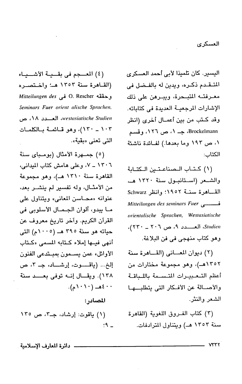 اليسير. كان تلميذا لأبى أحمد العسكرى المتقدم ذكره، ويدين له بالفضل فى معرفته المتبحرة، ويبرهن على ذلك الإشارات المرجعية العديدة فى كتاباته. وقد كتب من بين أعمال أخرى (انظر Brockelmann، جـ 1، ص 126 وقسم 1، ص 193 وما بعدها.) لفائدة ناشئة الكتاب: