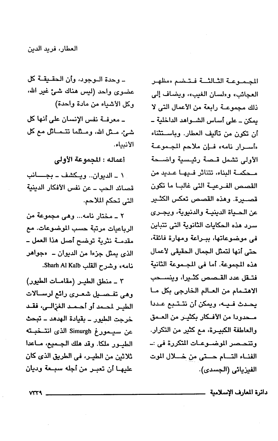 المجموعة الثالثة فتضم "مظهر العجائب" و"لسان الغيب"، ويضاف إلى ذلك مجموعة رابعة من الأعمال التى لا يمكن -على أساس الشواهد الداخلية- أن تكون من تأليف العطار. وباستثناء "أسرار نامه" فإن ملاحم المجموعة الأولى تشمل قصة رئيسية واضحة محكمة البناء، تتناثر فيها عديد من القصص الفرعية التى غالبا ما تكون قصيرة. وهذه القصص تعكس الكثير عن الحياة الدينية والدنيوية، ويجرى سرد هذه الحكايات الثانوية التى تتباين فى موضوعاتها، ببراعة ومهارة فائقة، حتى أنها لتمثل الجمال الحقيقى لأعمال هذه المجموعة. أما فى المجموعة الثانية فتقل عدد القصص كثيرا، وينسحب الاهتمام من العالم الخارجى بكل ما يحدث فيه، ويمكن أن نتتبع عددا محدودا من الأفكار بكثير من العمق والعاطفة الكبيرة، مع كثير من التكرار. وتنحصر الموضوعات المتكررة فى: الغناء التام حتى من خلال الموت الفيزيائى (الجسدى).