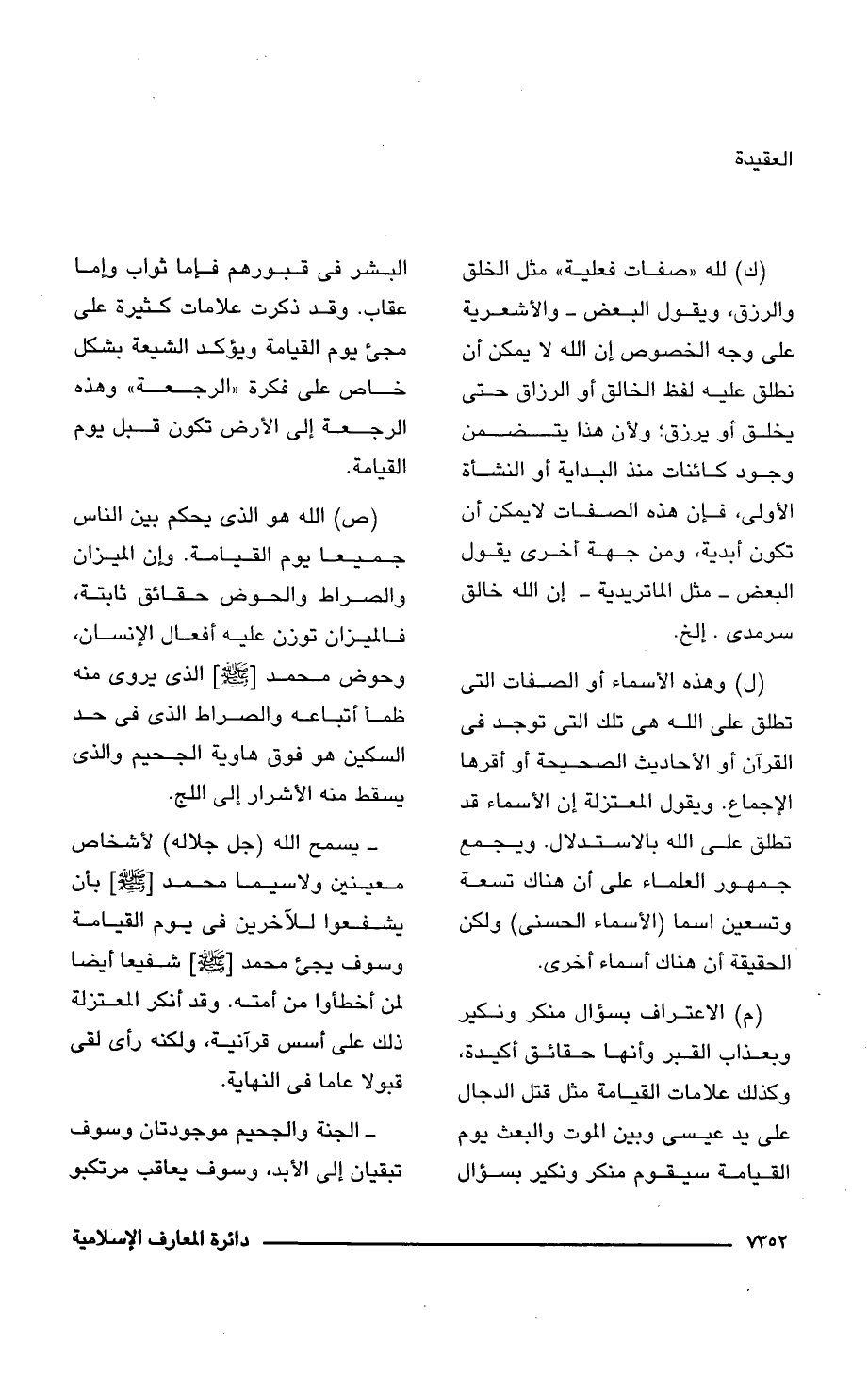 (ك) للَّه "صفات فعلية" مثل الخلق والرزق، ويقول البعض -والأشعرية على وجه الخصوص إن اللَّه لا يمكن أن نطلق عليه لفظ الخالق أو الرزاق حتى يخلق أو يرزق؛ ولأن هذا يتضمن وجود كائنات منذ البداية أو النشأة الأولى، فإن هذه الصفات لا يمكن أن تكون أبدية، ومن جهة أخرى يقول البعض -مثل الماتريدية- إن اللَّه خالق سرمدى. إلخ.