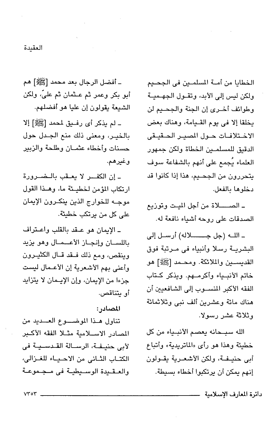 تناول هذا الموضوع العديد من المصادر الإسلامية مثلا الفقه الأكبر لأبى حنيفة، الرسالة القدسية فى الكتاب الثانى من الاحياء للغزالى، والعقيدة الوسيطية فى مجموعة