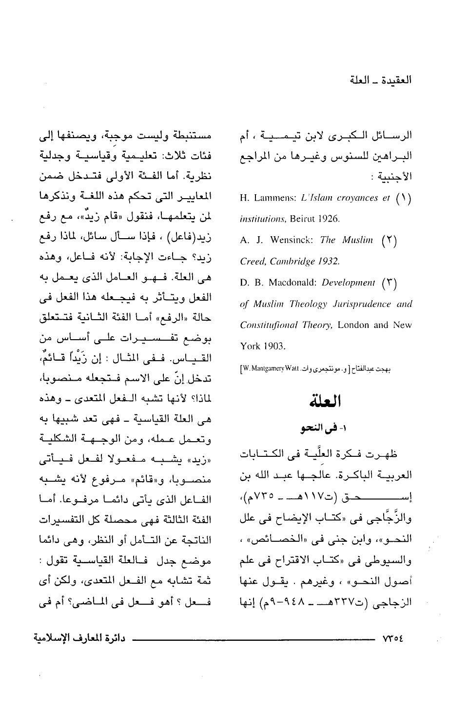 ظهرت فكرة العِلَّية فى الكتابات العربية الباكرة. عالجها عبد اللَّه بن إسحق (ت 117 هـ - 735 م)، والزَّجَّاجى فى "كتاب الإيضاح فى علل النحو"، وابن جنى فى "الخصائص"، والسيوطى فى "كتاب الاقتراح فى علم أصول النحو"، وغيرهم. يقول عنها الزجاجى (ت 337 هـ - 948 - 9 م) إنها مستنبطة وليست موجِبة، ويصنفها إلى فئات ثلاث: تعليمية وقياسية وجدلية نظرية. أما الفئة الأولى فتدخل ضمن المعايير التى تحكم هذه اللغة ونذكرها لمن يتعلمها، فنقول "قام زيدٌ"، مع رفع زيد (فاعل)، فإذا سأل سائل، لماذا رفع زيد؟ جاءت الإجابة: لأنه فاعل، وهذه هى العلة. فهو العامل الذى يعمل به الفعل ويتأثر به فيجعله هذا الفعل فى حالة "الرفع" أما الفئة الثانية فتتعلق بوضع تفسيرات على أساس من القياس. ففى المثال: إن زَيْد، قائمٌ، تدخل إنّ على الاسم فتجعله منصوبا، لماذا؟ لأنها تشبه الفعل المتعدى -وهذه هى العلة القياسية- فهى تعد شبيها به وتعمل عمله، ومن الوجهة الشكلية "زيد" يشبه مفعولا لفعل فيأتى منصوبا، و"قائم" مرفوع لأنه يشبه الفاعل الذى يأتى دائما مرفوعا. أما الفئة الثالثة فهى محصلة كل التفسيرات الناتجة عن التأمل أو النظر، وهى دائما موضع جدل فالعلة القياسية تقول: ثمة تشابه مع الفعل المتعدى، ولكن أى فعل؟ أهو فعل فى الماضى؟ أم فى