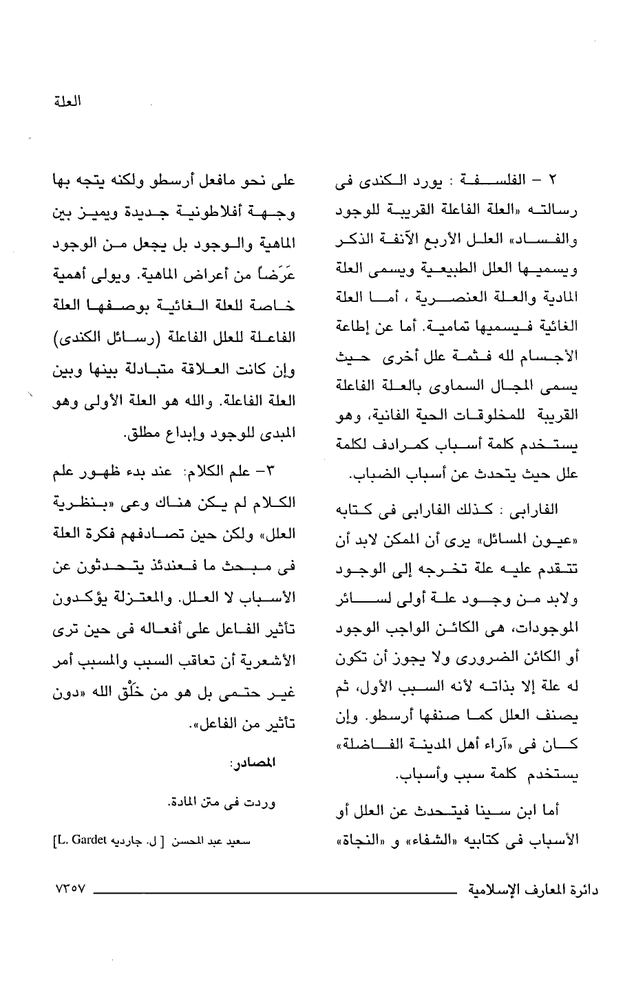 الفارابى: كذلك الفارابى فى كتابه "عيون المسائل" يرى أن الممكن لابد أن تتقدم عليه علة تخرجه إلى الوجود ولابد من وجود علة أولى لسائر الموجودات، هى الكائن الواجب الوجود أو الكائن الضرورى ولا يجوز أن تكون له علة إلا بذاته لأنه السبب الأول، ثم يصنف العلل كما صنفها أرسطو. وإن كان فى "آراء أهل المدينة الفاضلة" يستخدم كلمة سبب وأسباب.