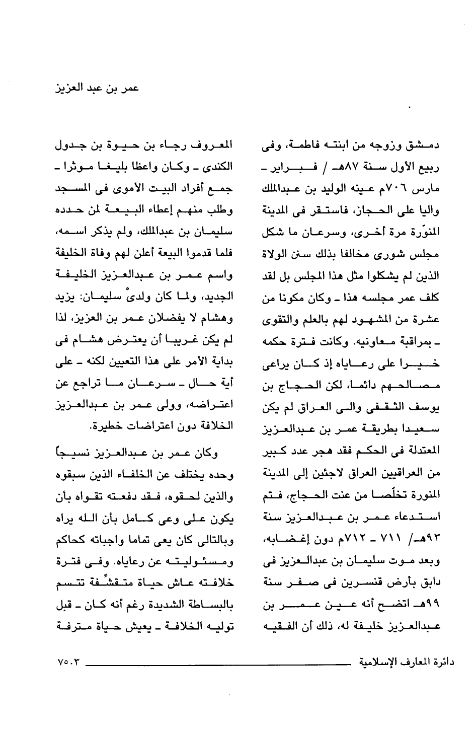 دمشق وزوجه من ابنته فاطمة، وفى ربيع الأول سنة 87 هـ/ فبراير - مارس 706 م عينه الوليد بن عبد الملك واليا على الحجاز، فاستقر فى المدينة المنوّرة مرة أخرى، وسرعان ما شكل مجلس شورى مخالفا بذلك سنن الولاة الذين لم يشكلوا مثل هذا المجلس بل لقد كلف عمر مجلسه هذا -وكان مكونا من عشرة من المشهود لهم بالعلم والتقوى- بمراقبة معاونيه. وكانت فترة حكمه خيرا على رعاياه إذ كان يراعى مصالحهم دائما، لكن الحجاج بن يوسف الثقفى والى العراق لم يكن سعيدا بطريقة عمر بن عبد العزيز المعتدلة فى الحكم فقد هجر عدد كبير من العراقيين العراق لاجئين إلى المدينة المنورة تخلّصا من عنت الحجاج، فتم استدعاء عمر بن عبد العزيز سنة 93 هـ/ 711 - 712 م دون إغضابه، وبعد موت سليمان بن عبد العزيز فى دابق بأرض قنسرين فى صفر سنة 99 هـ اتضح أنه عين عمر بن عبد العزيز خليفة له، ذلك أن الفقيه المعروف رجاء بن حيوة بن جدول الكندى -وكان واعظا بليغا موثرا- جمع أفراد البيت الأموى فى المسجد وطلب منهم إعطاء البيعة لمن حدده سليمان بن عبد الملك، ولم يذكر اسمه، فلما قدموا البيعة أعلن لهم وفاة الخليفة واسم عمر بن عبد العزيز الخليفة الجديد، ولكن ولدى سليمان: يزيد وهشام لا يفضلان عمر بن العزيز، لذا لم يكن غريبا أن يعترض هشام فى بداية الأمر على هذا التعيين لكنه -على أية حال- سرعان ما تراجع عن اعتراضه، وولى عمر بن عبد العزيز الخلافة دون اعتراضات خطيرة.