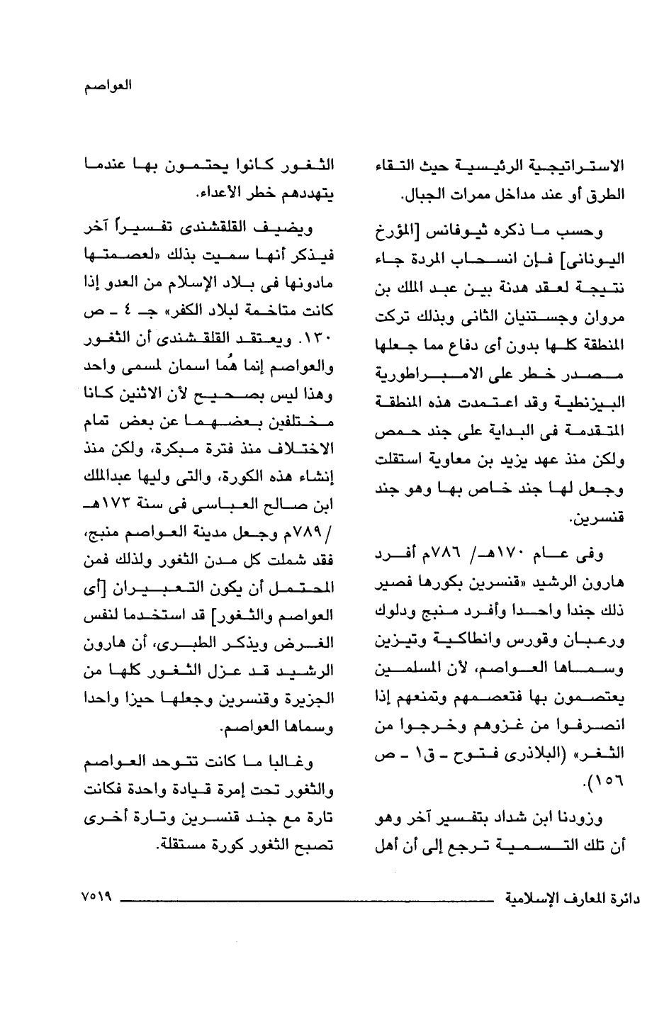 ويضيف القلقشندى تفسيرًا آخر فيذكر أنها سميت بذلك "لعصمتها ما دونها فى بلاد الإسلام من العدو إذا كانت متاخمة لبلاد الكفر" جـ 4 - ص 130. ويعتقد القلقشندى أن الثغور والعواصم إنما هُما اسمان لمسمى واحد وهذا ليس بصحيح لأن الاثنين كانا مختلفين بعضهما عن بعض تمام الاختلاف منذ فترة مبكرة، ولكن منذ إنشاء هذه الكورة، والتى وليها عبد الملك ابن صالح العباسى فى سنة 172 هـ/ 789 م وجعل مدينة العواصم منبج، فقد شملت كل مدن الثغور ولذلك فمن المحتمل أن يكون التعبيران [أى العواصم والثغور] قد استخدما لنفس الغرض ويذكر الطبرى، أن هارون الرشيد قد عزل الثغور كلها من الجزيرة وقنسرين وجعلها حيزا واحدا وسماها العواصم.