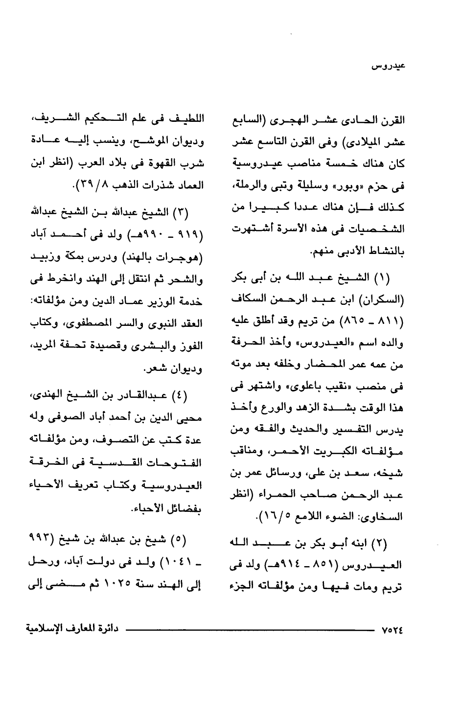 (2) ابنه أبو بكر بن عبد اللَّه العيدروس (851 - 914 هـ) ولد فى تريم ومات فيها ومن مؤلفاته الجزء اللطيف فى علم التحكيم الشريف، وديوان الموشح، وينسب إليه عادة شرب القهوة فى بلاد العرب (انظر ابن العماد شذرات الذهب 8/ 39).