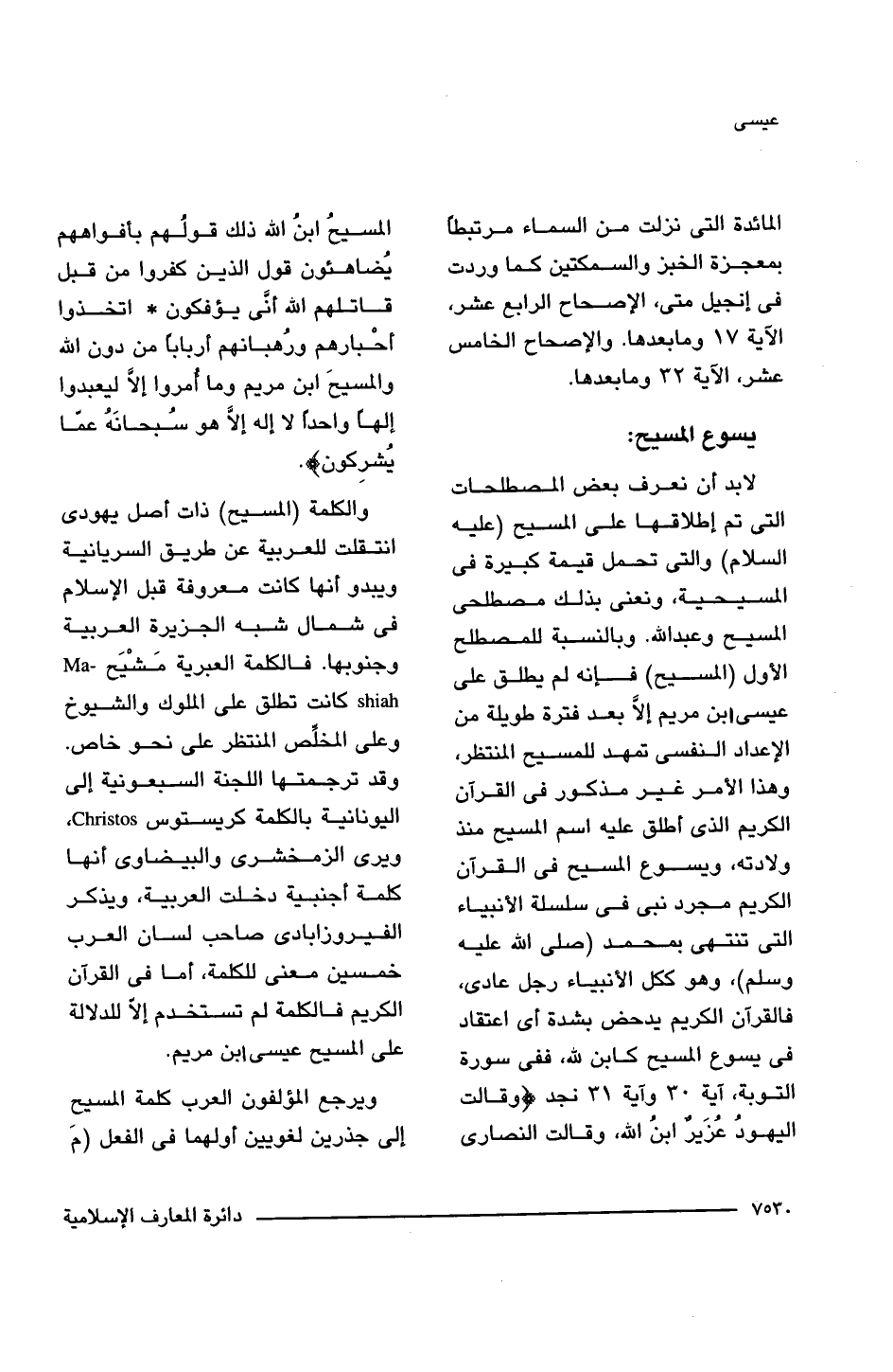 لا بد أن نعرف بعض المصطلحات التى تم إطلاقها على المسيح (عليه السلام) والتى تحمل قيمة كبيرة فى المسيحية، ونعنى بذلك مصطلحى المسيح وعبد اللَّه. وبالنسبة للمصطلح الأول (المسيح) فإنه لم يطلق على عيسى ابن مريم إلَّا بعد فترة طويلة من الإعداد النفسى تمهد للمسيح المنتظر، وهذا الأمر غير مذكور فى القرآن الكريم الذى أطلق عليه اسم المسيح منذ ولادته، ويسوع المسيح فى القرآن الكريم مجرد نبى فى سلسلة الأنبياء التى تنتهى بمحمد (صلى اللَّه عليه وسلم)، وهو ككل الأنبياء رجل عادى، فالقرآن الكريم يدحض بشدة أى اعتقاد فى يسوع المسيح كابن للَّه، ففى سورة التوبة، آية 30 وآية 31 نجد {وَقَالَتِ الْيَهُودُ عُزَيْرٌ ابْنُ اللَّهِ وَقَالَتِ النَّصَارَى الْمَسِيحُ ابْنُ اللَّهِ ذَلِكَ قَوْلُهُمْ بِأَفْوَاهِهِمْ يُضَاهِئُونَ قَوْلَ الَّذِينَ كَفَرُوا مِنْ قَبْلُ قَاتَلَهُمُ اللَّهُ أَنَّى يُؤْفَكُونَ (30) اتَّخَذُوا أَحْبَارَهُمْ وَرُهْبَانَهُمْ أَرْبَابًا مِنْ دُونِ اللَّهِ وَالْمَسِيحَ ابْنَ مَرْيَمَ وَمَا أُمِرُوا إِلَّا لِيَعْبُدُوا إِلَهًا وَاحِدًا لَا إِلَهَ إِلَّا هُوَ سُبْحَانَهُ عَمَّا يُشْرِكُونَ}.