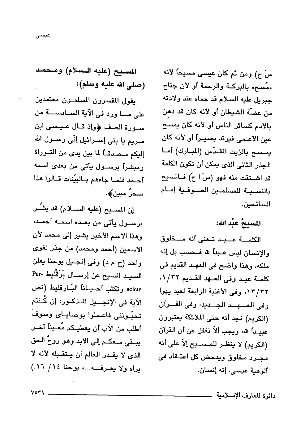 الكلمة عبد تعنى أنه مخلوق والإنسان ليس عبدًا للَّه فحسب بل إنه ملكه، وهذا واضح فى العهد القديم فى كلمة عبد وفى العهد القديم 32/ 1، 32/ 13، وفى الأغنية الرابعة لعبد يهوا وفى العهد الجديد، وفى القرآن (الكريم) نجد أنه حتى الملائكة يعتبرون عبيدًا للَّه، ويجب ألَّا نغفل عن أن القرآن (الكريم) لا ينظر للمسيح إلا على أنه مجرد مخلوق ويدحض كل اعتقاد فى ألوهية عيسى. إنه إنسان.