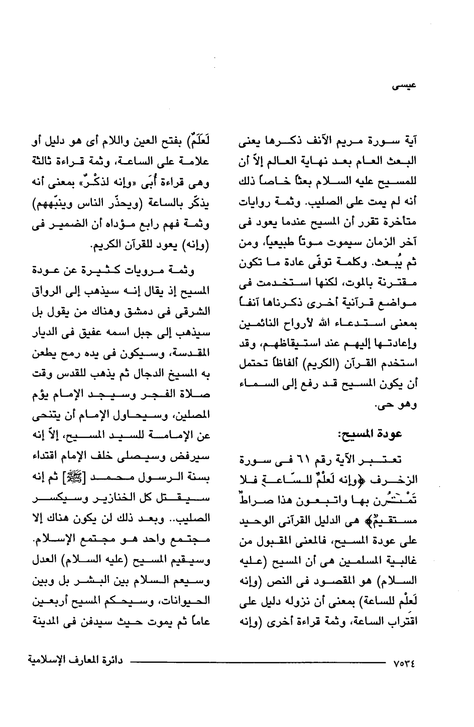 تعتبر الآية رقم 61 فى سورة الزخرف {وَإِنَّهُ لَعِلْمٌ لِلسَّاعَةِ فَلَا تَمْتَرُنَّ بِهَا وَاتَّبِعُونِ هَذَا صِرَاطٌ مُسْتَقِيمٌ} هى الدليل القرآنى الوحيد على عودة المسيح، فالمعنى المقبول من غالبية المسلمين هى أن المسيح (عليه السلام) هو المقصود فى النص (وإنه لَعلْم للساعة) بمعنى أن نزوله دليل على اقتَراب الساعة، وثمة قراءة أخرى (وإنه لَعَلَمٌ) بفتح العين واللام أى هو دليل أو علامة على الساعة، وثمة قراءة ثالثة وهى قراءة أُبَى "وإنه لذكْرٌ" بمعنى أنه يذكّر بالساعة (ويحذر الناس وينبّههم) وثمة فهم رابع مؤداه أن الضمير فى (وإنه) يعود للقرآن الكريم.