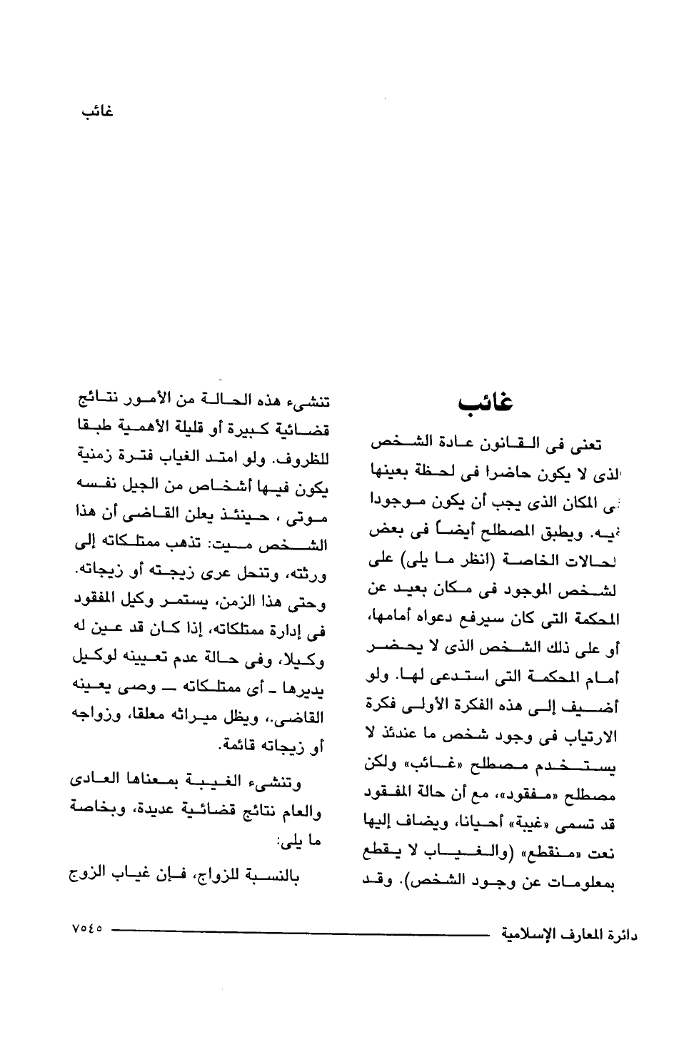 تعنى فى القانون عادة الشخص الذى لا يكون حاضرا فى لحظة بعينها فى المكان الذى يجب أن يكون موجودا فيه. ويطبق المصطلح أيضًا فى بعض لحالات الخاصة (انظر ما يلى) على لشخص الموجود فى مكان بعيد عن المحكمة التى كان سيرفع دعواه أمامها، أو على ذلك الشخص الذى لا يحضر أمام المحكمة التى استدعى لها. ولو أضيف إلى هذه الفكرة الأولى فكرة الارتياب فى وجود شخص ما عندئذ لا يستخدم مصطلح "غائب" ولكن مصطلح "مفقود"، مع أن حالة المفقود قد تسمى "غيبة" أحيانا، ويضاف إليها نعت "منقطع" (والغياب لا يقطع بمعلومات عن وجود الشخص). وقد تنشئ هذه الحالة من الأمور نتائج قضائية كبيرة أو قليلة الأهمية طبقا للظروف. ولو امتد الغياب فترة زمنية يكون فيها أشخاص من الجيل نفسه موتى، حينئذ يعلن القاضى أن هذا الشخص ميت: تذهب ممتلكاته إلى ورثته، وتنحل عرى زيجته أو زيجاته. وحتى هذا الزمن، يستمر وكيل المفقود فى إدارة ممتلكاته، إذا كان قد عين له وكيلا، وفى حالة عدم تعيينه لوكيل يديرها -أى ممتلكاته- وصى يعينه القاضى، ويظل ميراثه معلقا، وزواجه أو زيجاته قائمة.