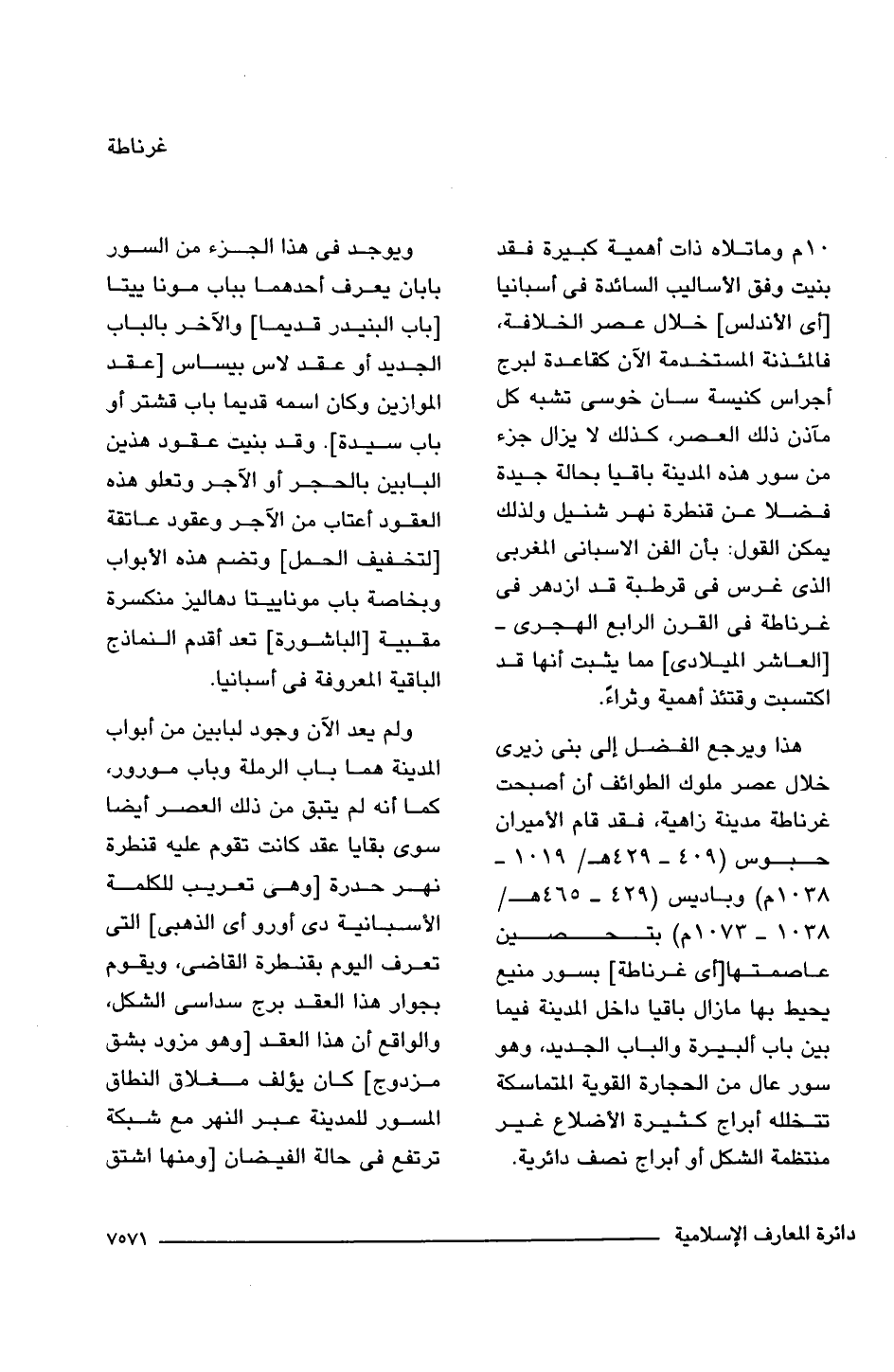 هذا ويرجع الفضل إلى بنى زيرى خلال عصر ملوك الطوائف أن أصبحت غرناطة مدينة زاهية، فقد قام الأميران حبوس (409 - 429 هـ/ 1019 - 1038 م) وباديس (429 - 465 هـ/ 1038 - 1073 م) بتحصين عاصمتها [أى غرناطة] بسور منيع يحيط بها ما زال باقيا داخل المدينة فيما بين باب ألبيرة والباب الجديد، وهو سور عال من الحجارة القوية المتماسكة تتخلله أبراج كثيرة الأضلاع غير منتظمة الشكل أو أبراج نصف دائرية.