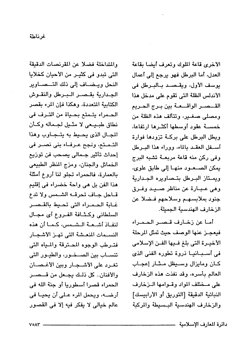أما عن زخارف قصر الحمراء فيعجز عنها الوصف حيث تمثل المرحلة الأخيرة التى بلغ فيها الفن الإسلامى فى أسبانيا ذروة تطوره الفنى الذى كان وما يزال وسيظل مثار إعجاب العالم بأسره، وقد نفذت هذه الزخارف على مختلف المواد وقوامها الزخارف النباتية الدقيقة [التوريق أو الأرابيسك] والزخارف الهندسية البسيطة والمركبة والمتداخلة فضلا عن المقرنصات الدقيقة التى تبدو فى كثير من الأحيان كخلايا النحل ويضاف إلى ذلك التصاوير الجدارية بقصر البرطل والنقوش الكتابية المتعددة، وهكذا فإن المرء بقصر الحمراء يتمتع بحياة من الترف فى نطاق طبيعى لا مثيل لجماله وكأن المجال الذى يحيط به يتجاوب وهذا التمتع، ونجح عرفاء بنى نصر فى إحداث تأثير جمالى يصحب فن توزيع الخمائل والجنان، ومزج المنظر الطبيعى بالعمارة، فالحمراء تجلو لنا أروع أمثلة هذا الفن بل هى واحة خضراء فى إقليم قاحل جاف تحرقه الشمس ولا تدع غابة الحمراء التى تحيط بالقصر السلطانى وكثافة الفروع أى مجال لنفاذ أشعة الشمس، كما أن هذه النسمات المنعشة التى تهز الأشجار فترطب الوجوه المحترقة والمياه التى تنساب بين الصخور، والطيور التى تغرد على الأشجار وبين الأغصان والأفنان. . كل ذلك يجعل من قصر الحمراء قصرا أسطوريا أو جنة اللَّه فى أرضه، ويحمل المرء على أن يحيى فى عالم خيالى لا يفكر فيه إلا فى القصور